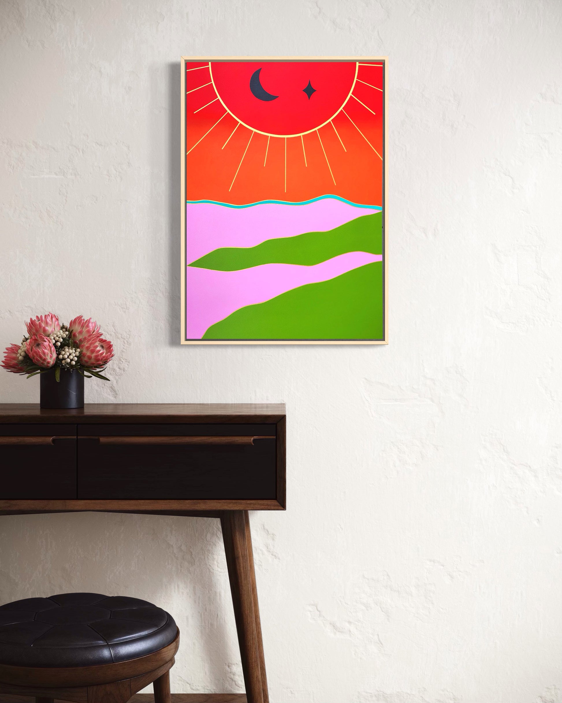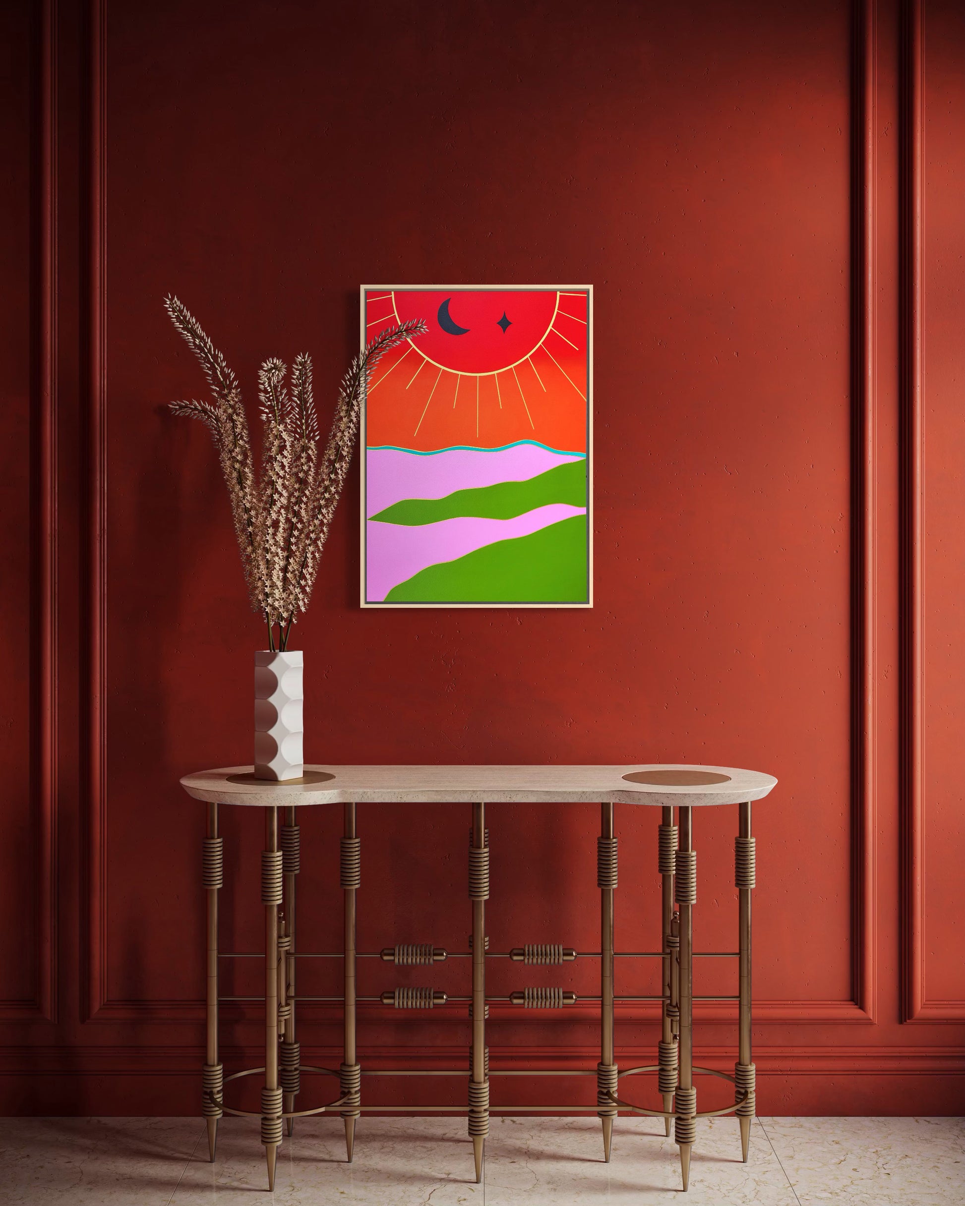 The "Sun & Moons" series is a collection of colorful, fairy-tale landscapes with characteristic, geometric elements of the golden sun and moon, which was created in 2023. I created the collection with those in mind who need a bit of magic and color in their lives every day. The addition of gold metallic paint on the paintings gives them noble shine and combines all the works into one coherent collection.