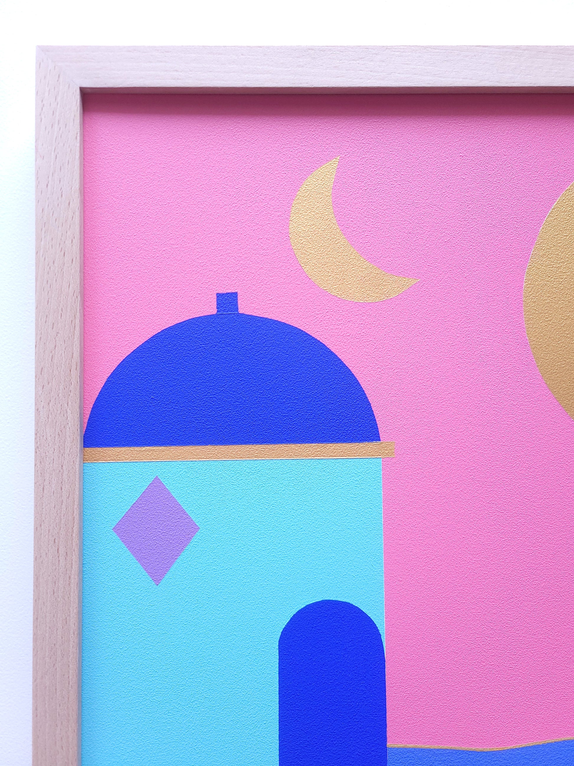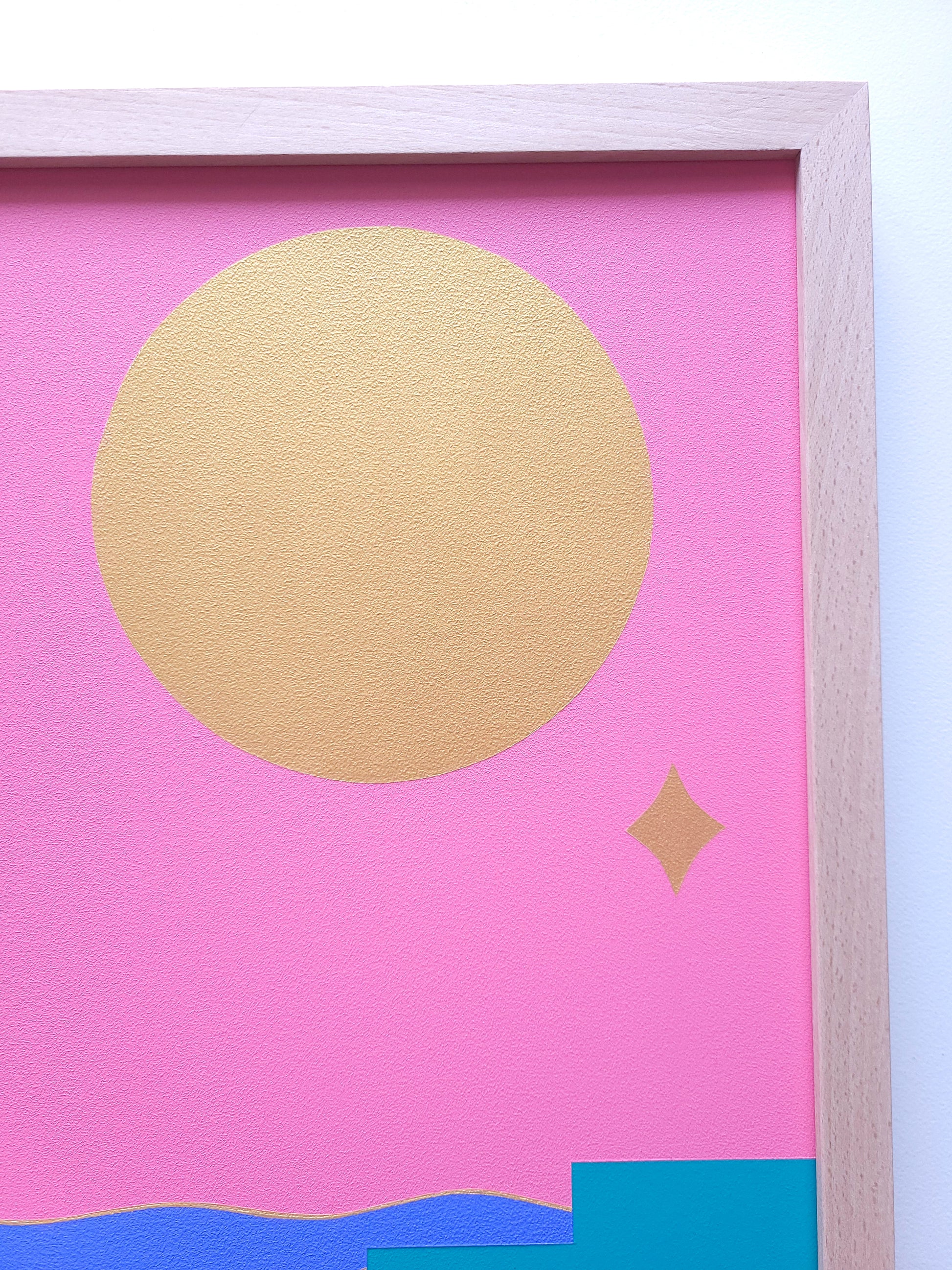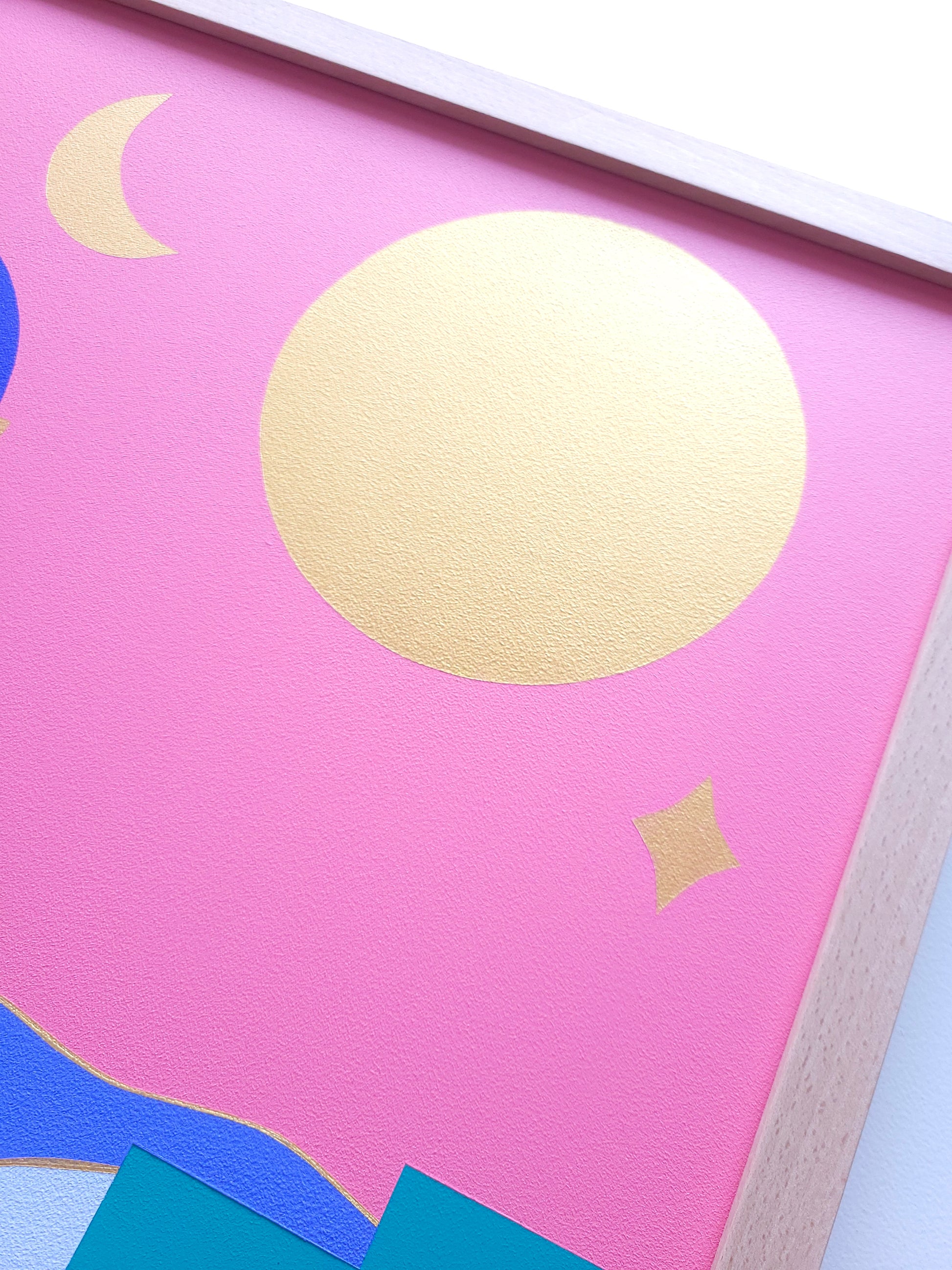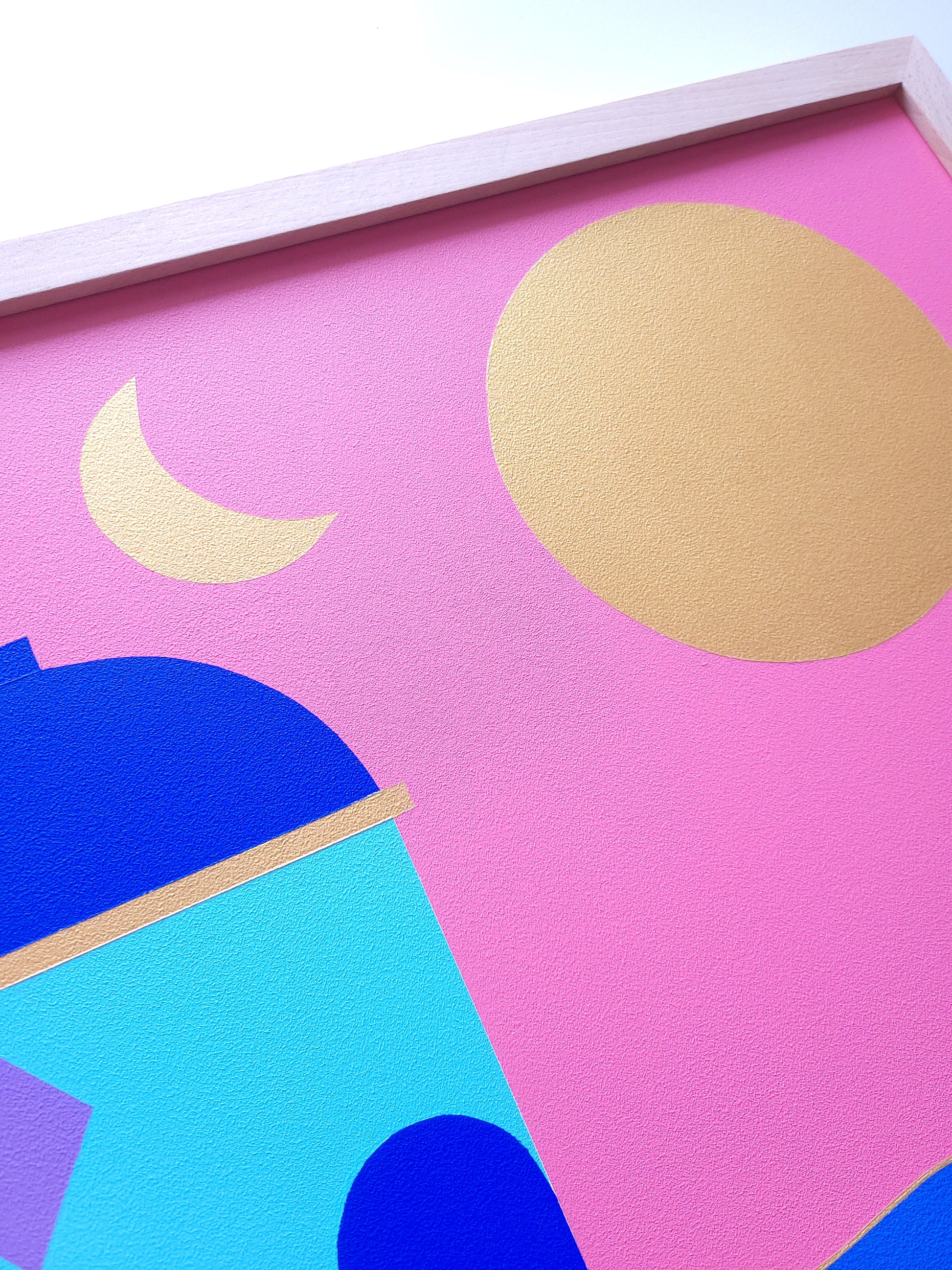 The "Sun & Moons" series is a collection of colorful, fairy-tale landscapes with characteristic, geometric elements of the golden sun and moon, which was created in 2023. I created the collection with those in mind who need a bit of magic and color in their lives every day. The addition of gold metallic paint on the paintings gives them noble shine and combines all the works into one coherent collection.