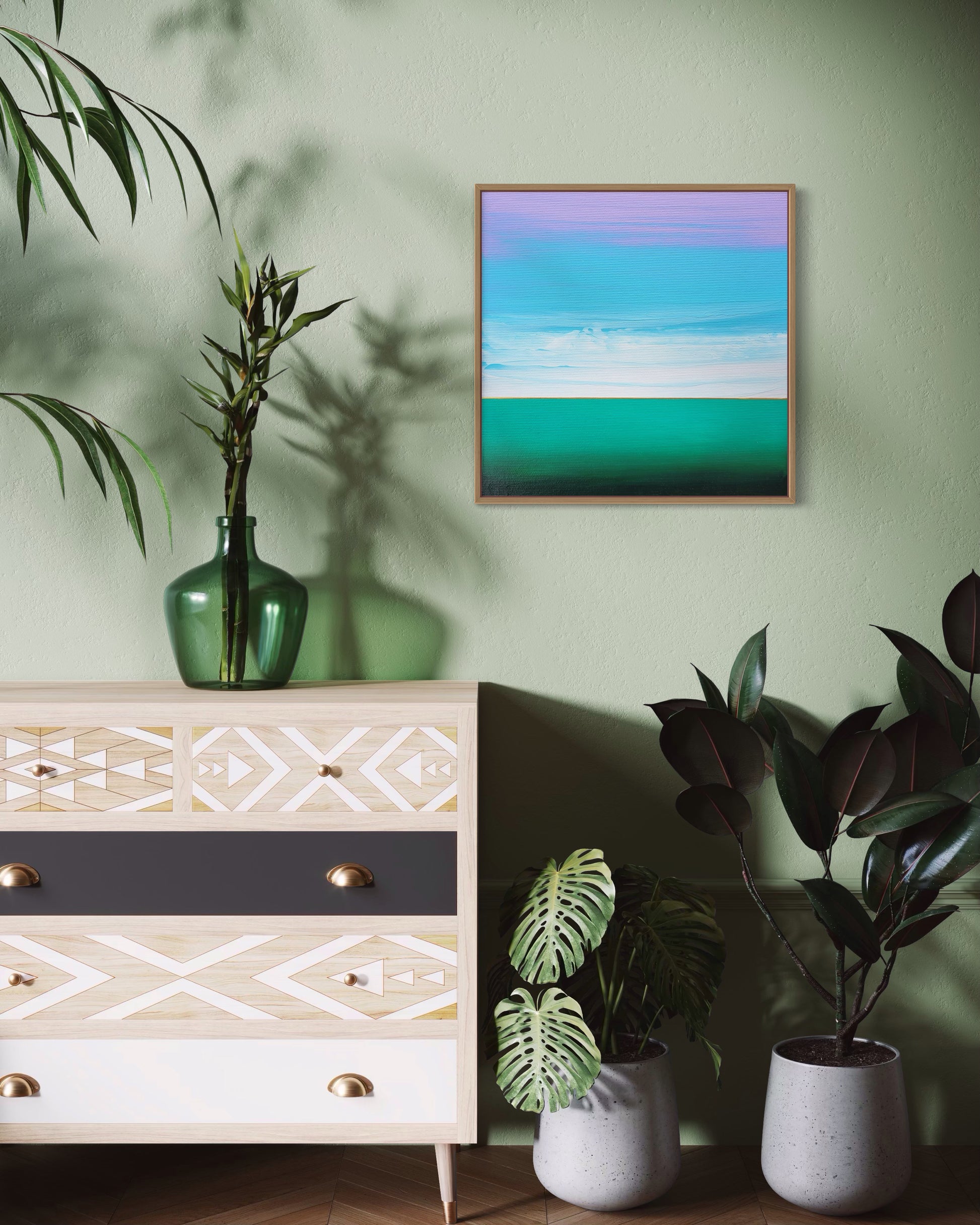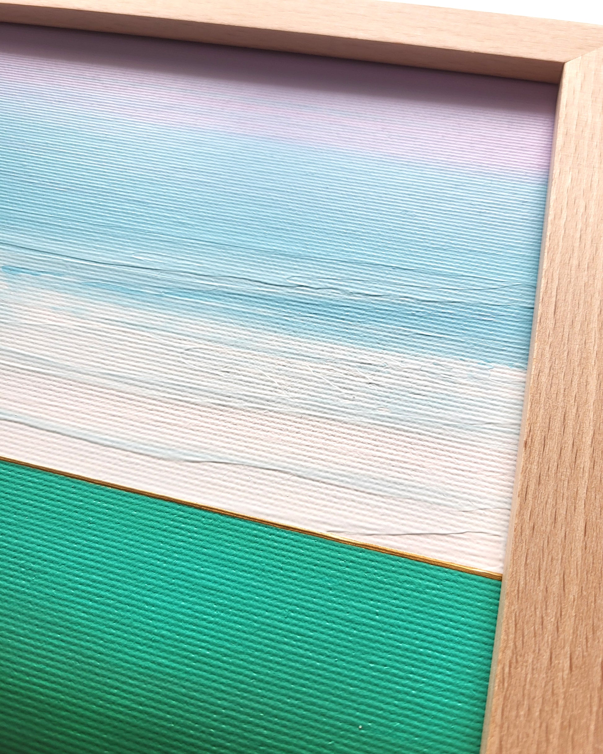 Zielonkawa toń morza a nad nią chmury poetycko płynące po błękicie nieba... Abstrakcyjny pejzaż w odcieniach turkusowej zieleni, bieli, fioletu i błękitu z elementami złotej metalicznej farby.
