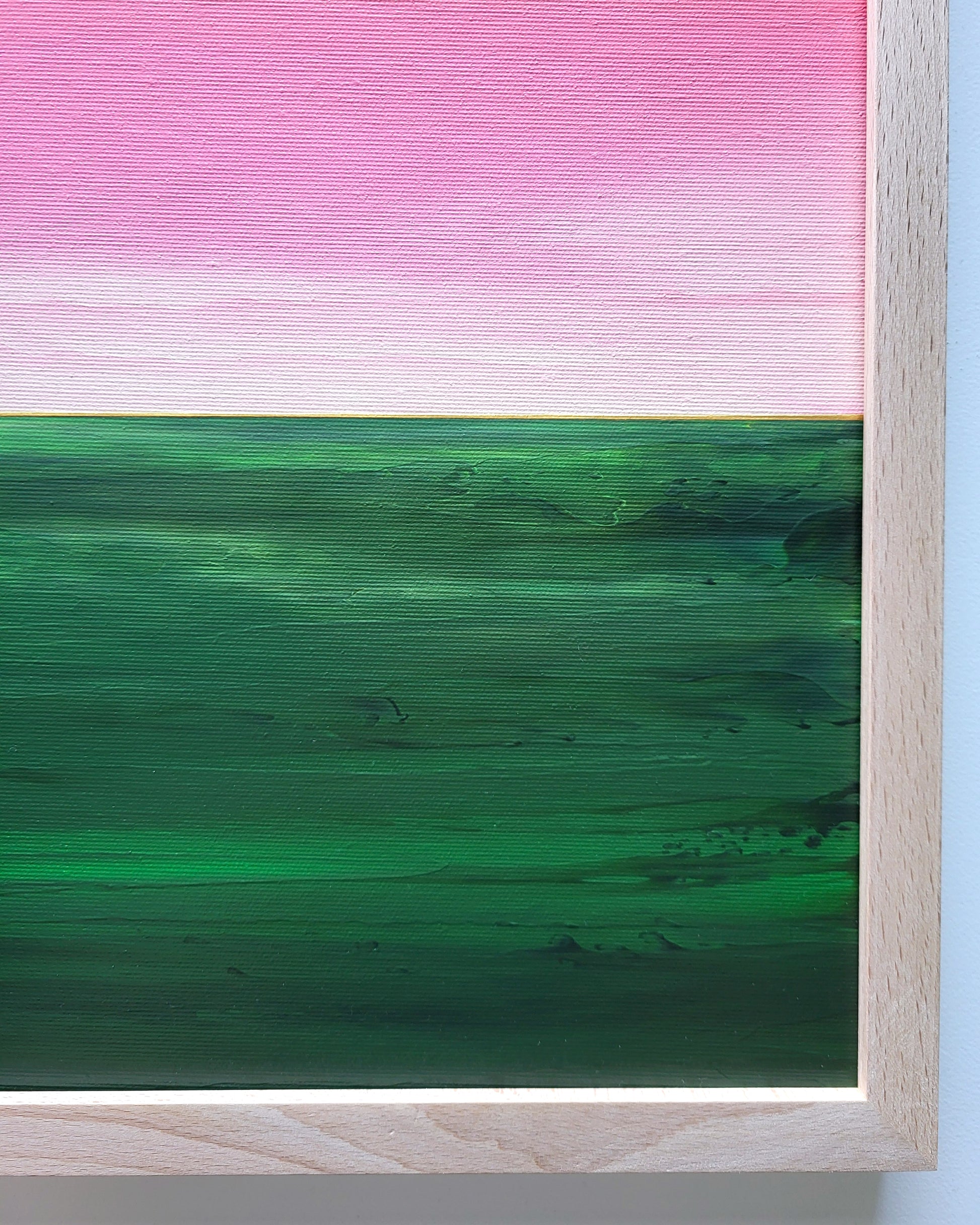 Blask nadchodzącego poranka, rozświetlający sierpniowe łąki... Abstrakcyjny pejzaż w odcieniach zieleni, pomarańczu i różu z elementami złotej metalicznej farby.