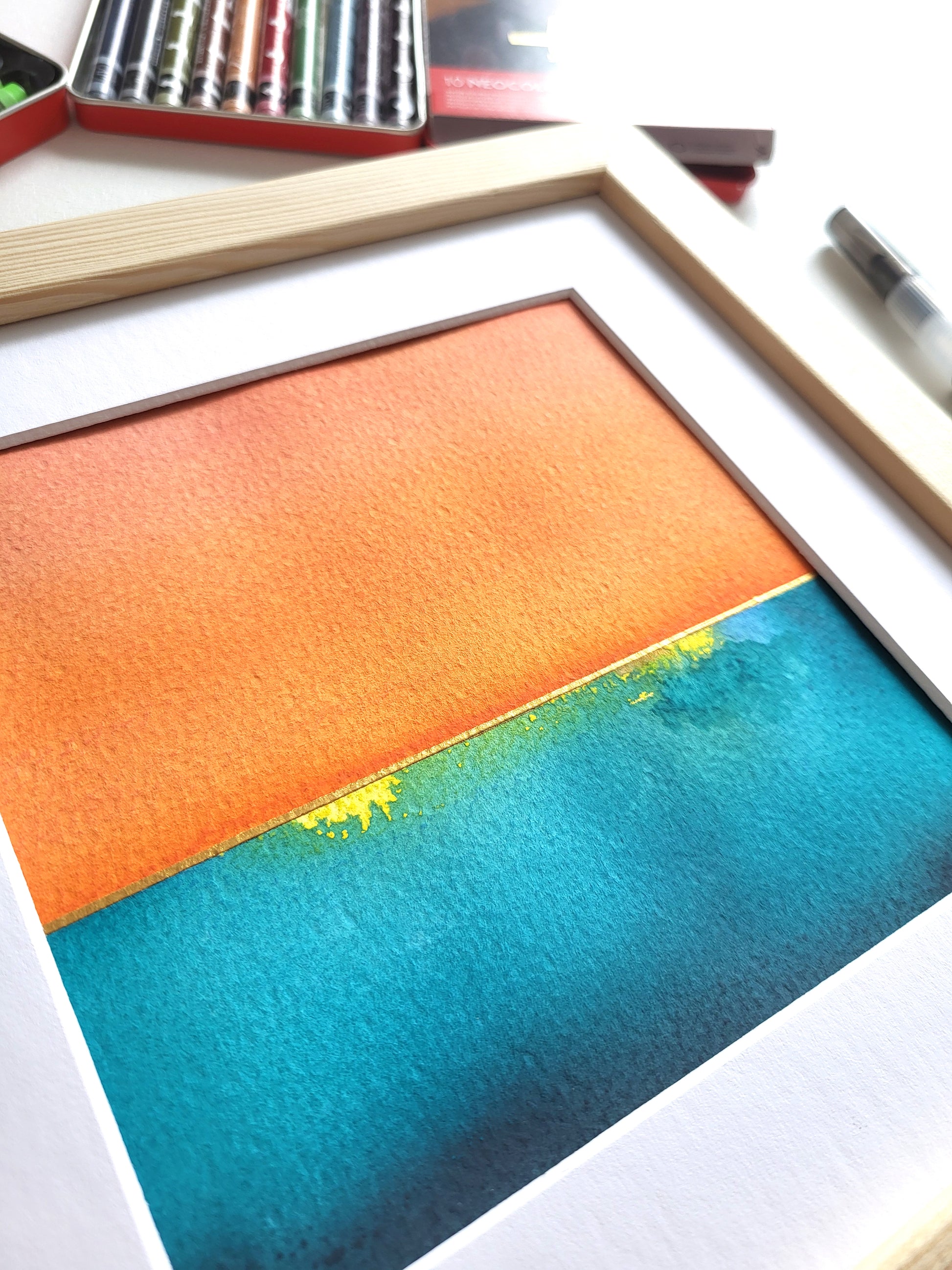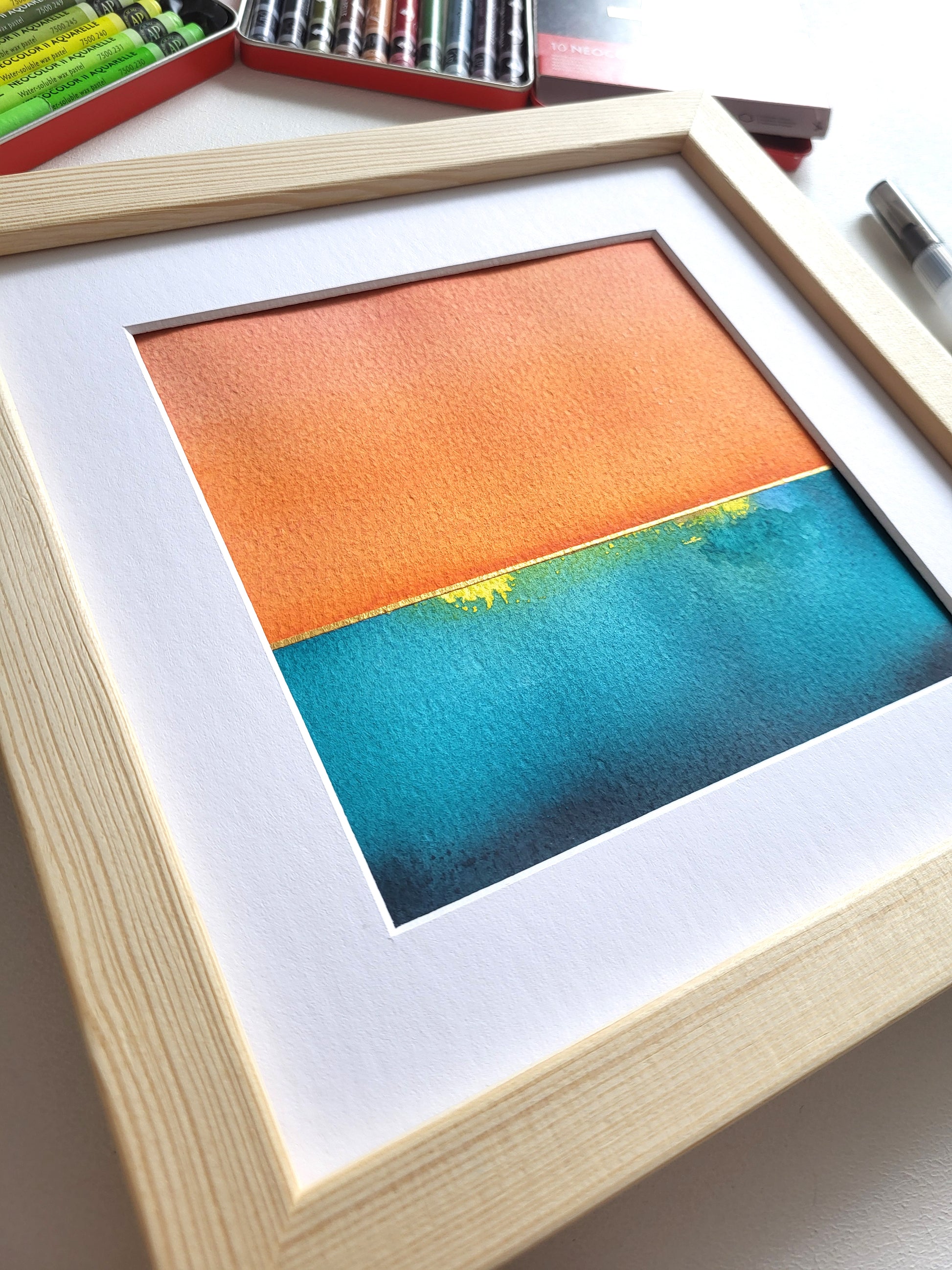 Praca na papierze akwarelowym z kolekcji "Golden Horizon", wyróżniająca się przepiękną, żywą kolorystyką oraz subtelnymi złotymi akcentami.