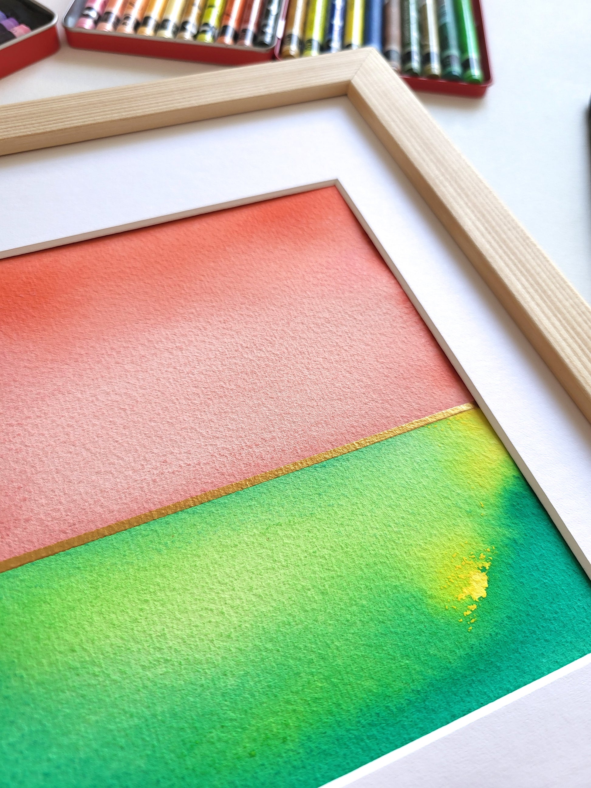 Praca na papierze akwarelowym z kolekcji "Golden Horizon", wyróżniająca się przepiękną, żywą kolorystyką oraz subtelnymi złotymi akcentami.
