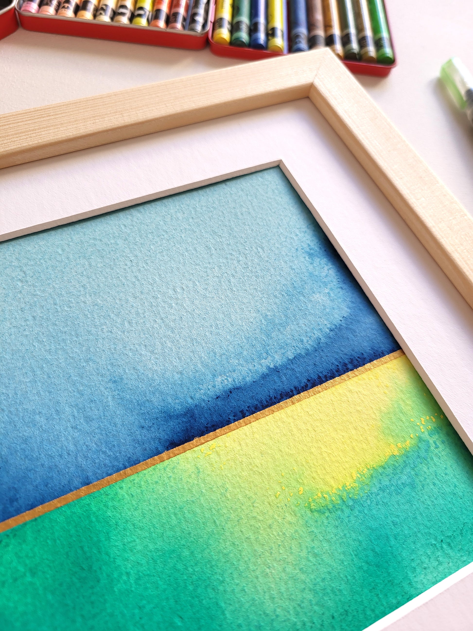 Praca na papierze akwarelowym z kolekcji "Golden Horizon", wyróżniająca się przepiękną, żywą kolorystyką oraz subtelnymi złotymi akcentami.
