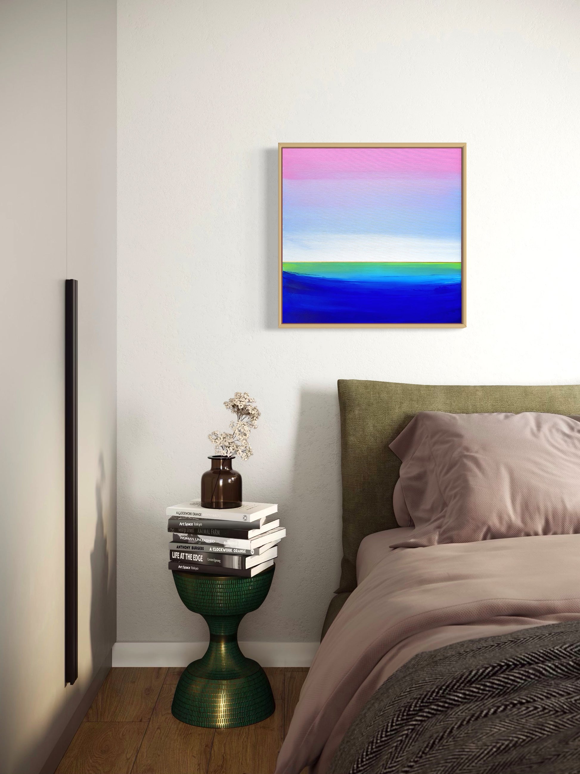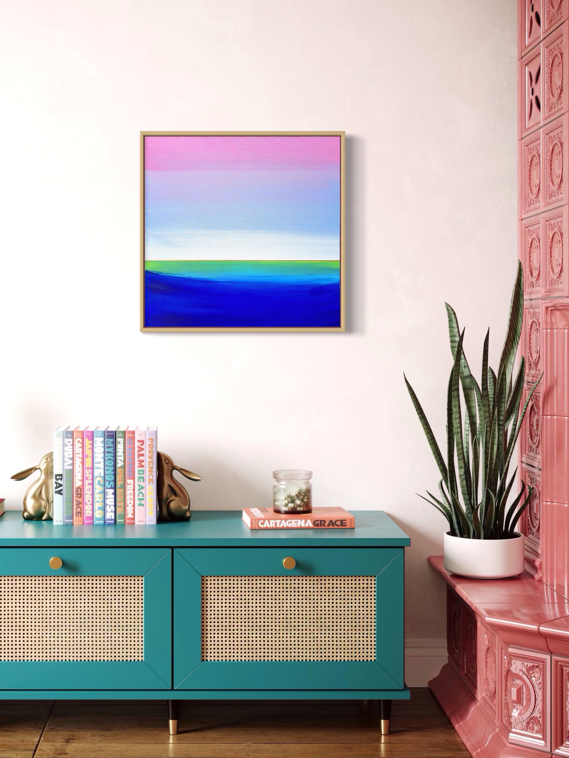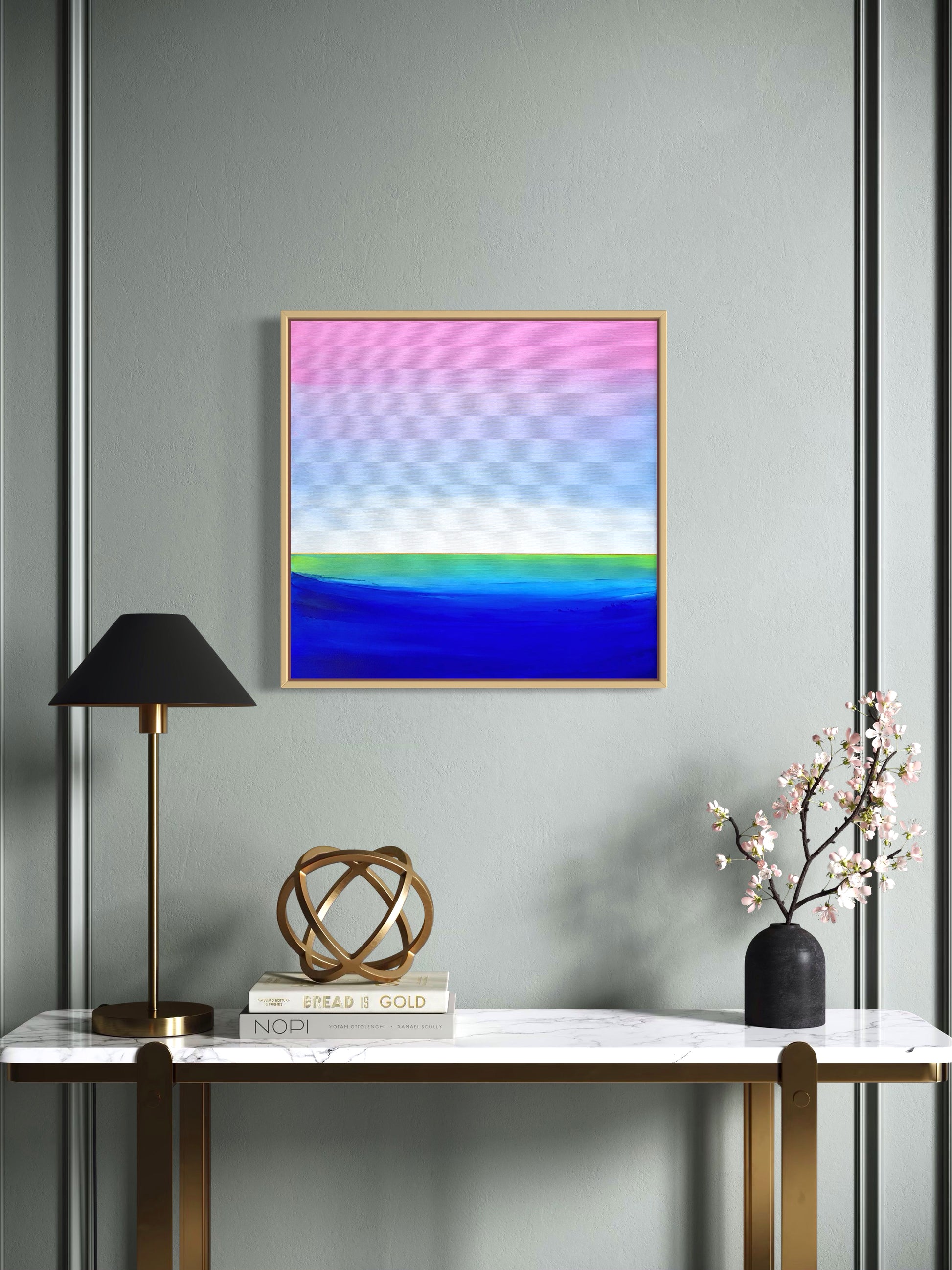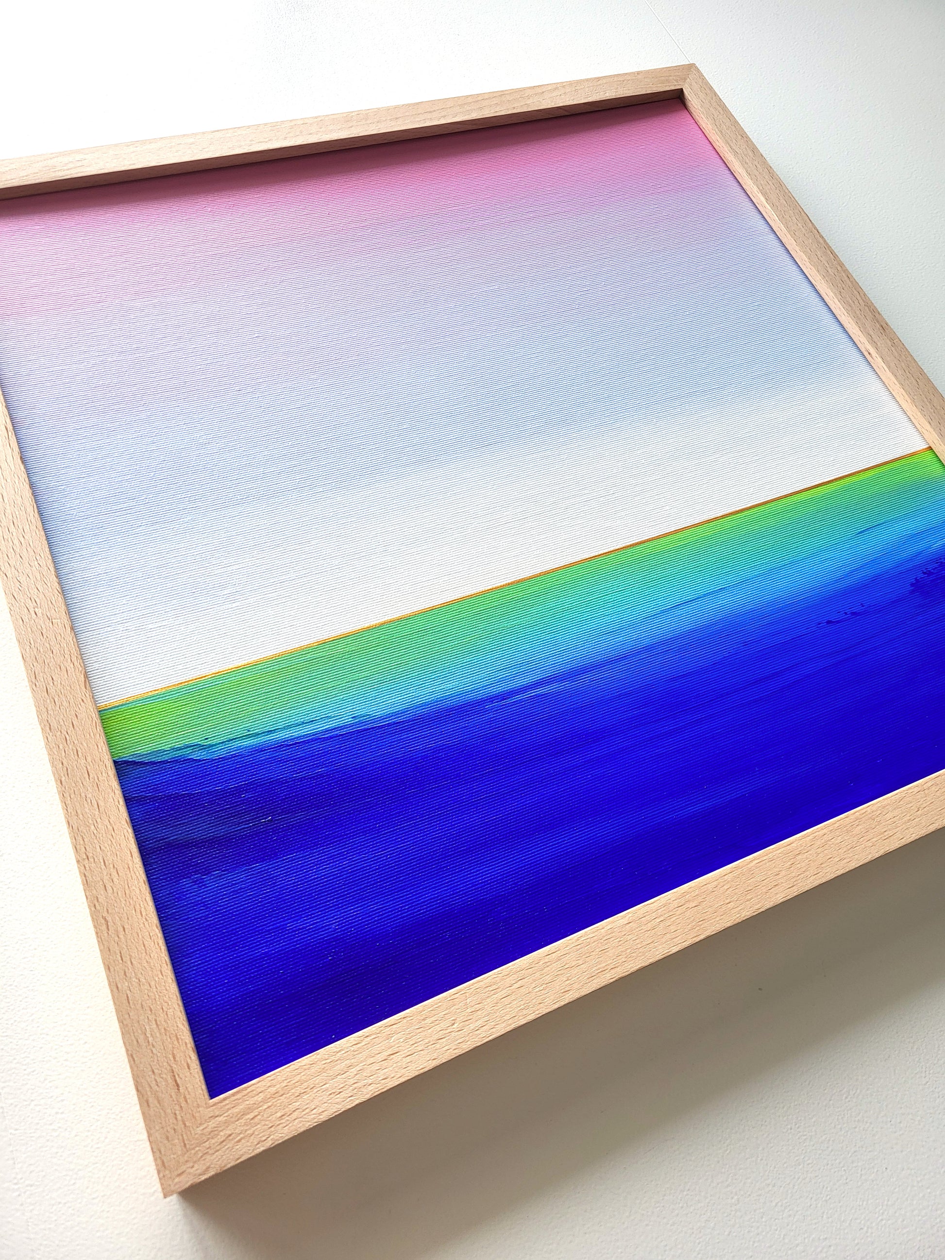 Poetycka podróż przez jeziorną toń... Abstrakcyjny pejzaż w odcieniach błękitu, różu i zieleni z elementami złotej metalicznej farby.