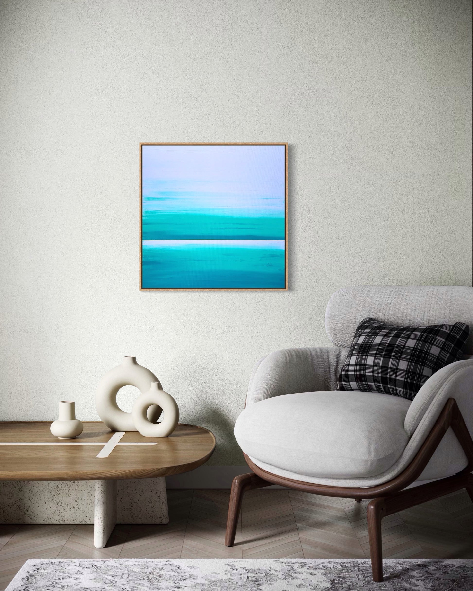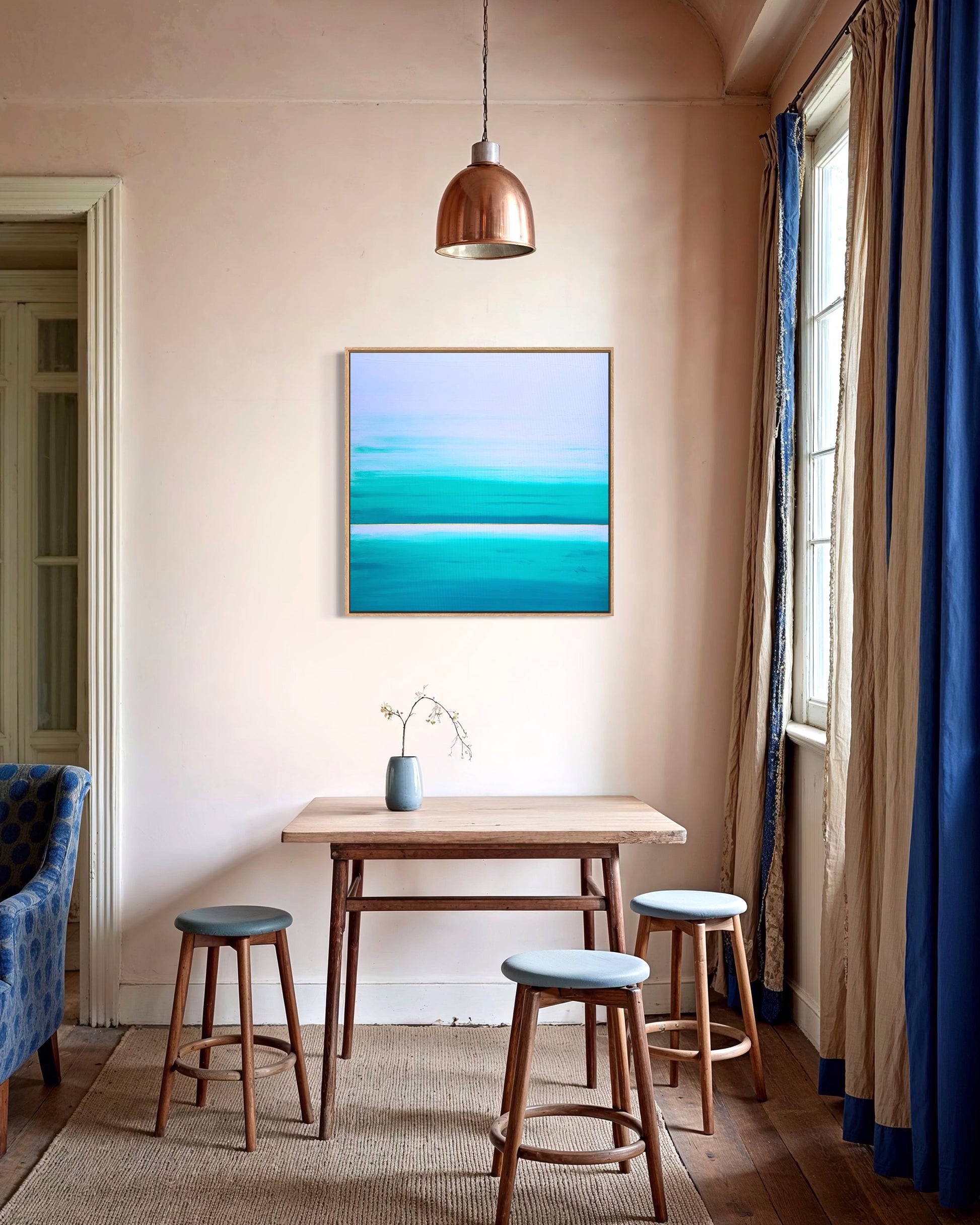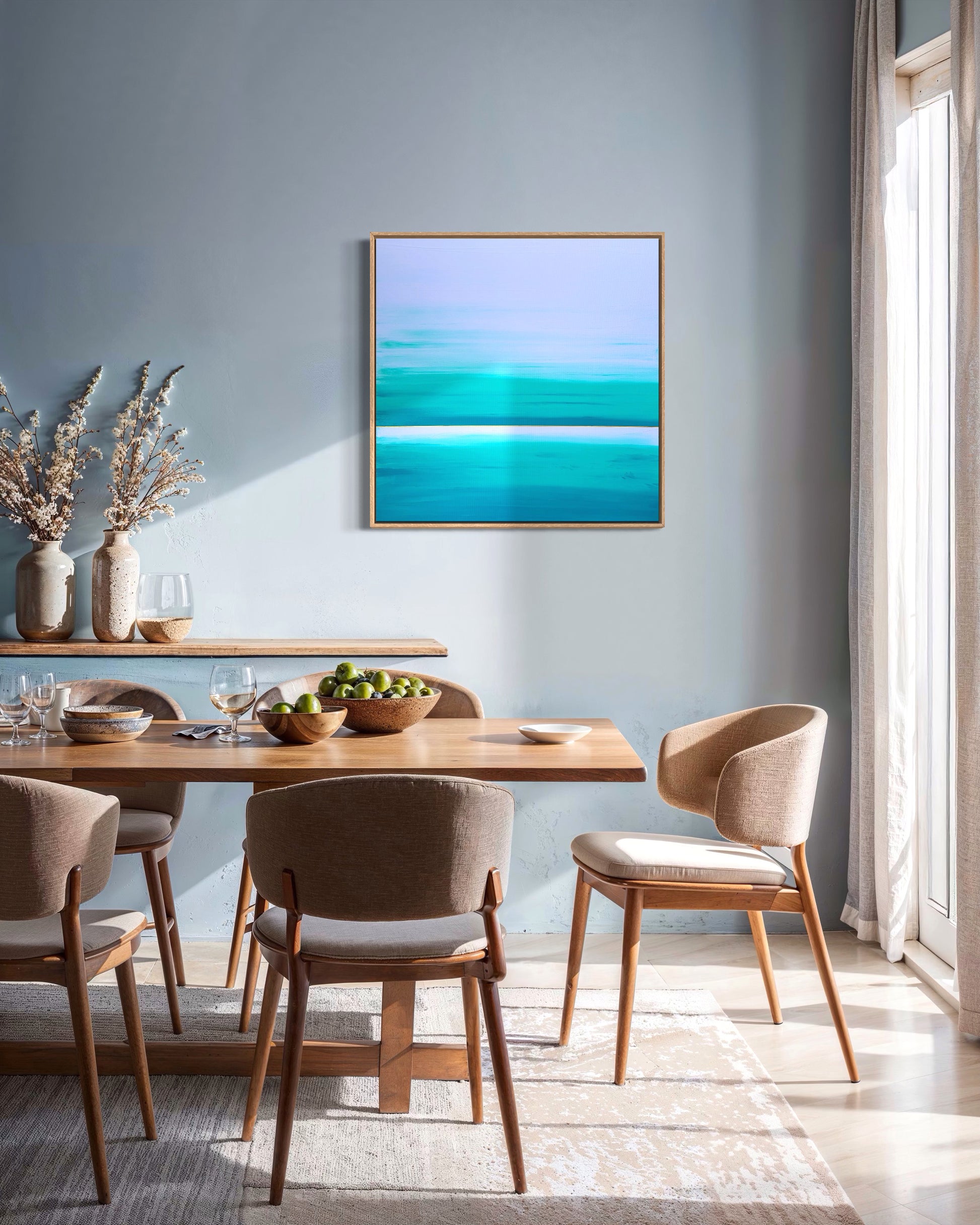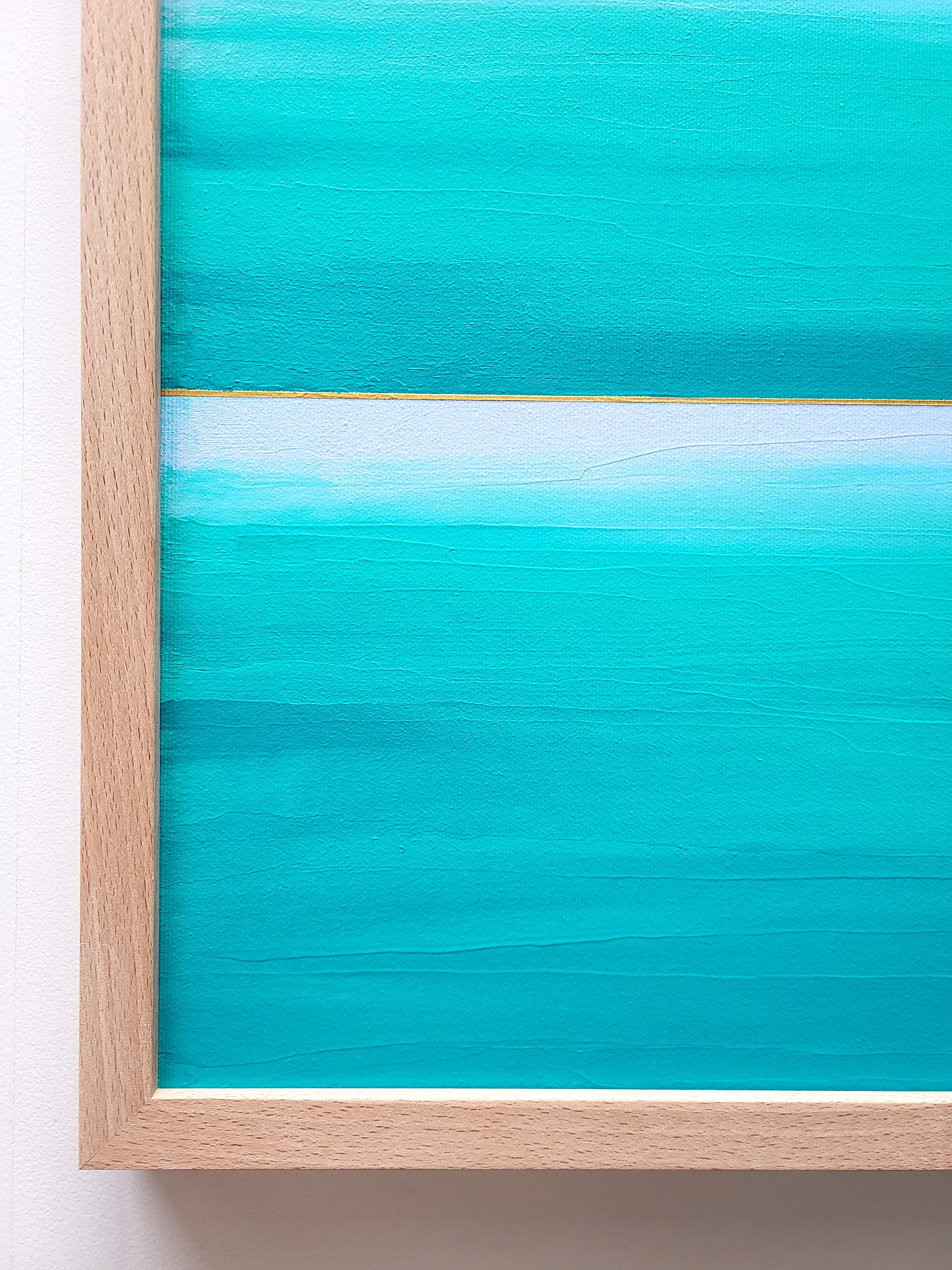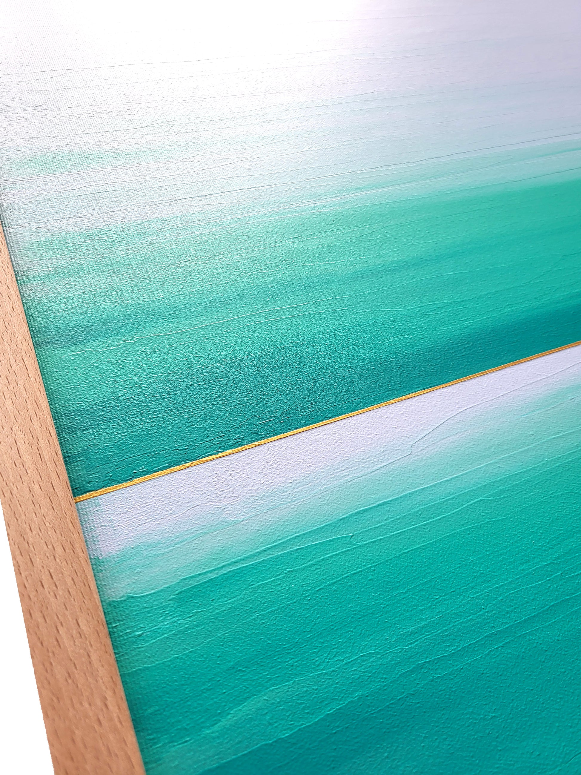 Mgły tajemniczo snujące się nad taflą jeziora... Abstrakcyjny pejzaż w odcieniach turkusu i błękitu z elementami złotej metalicznej farby.