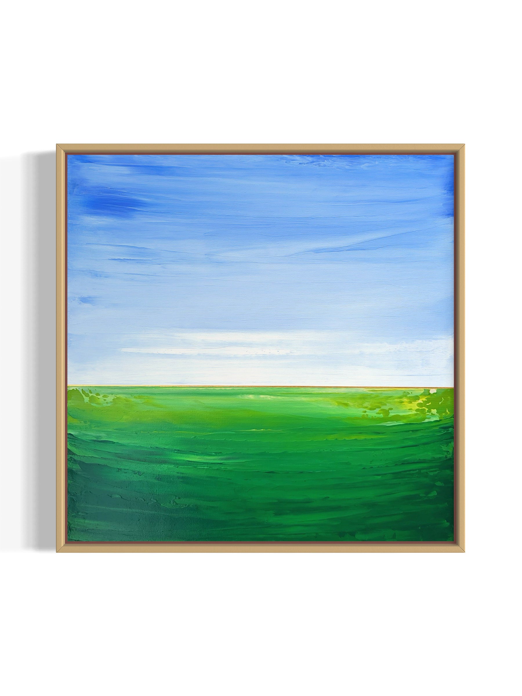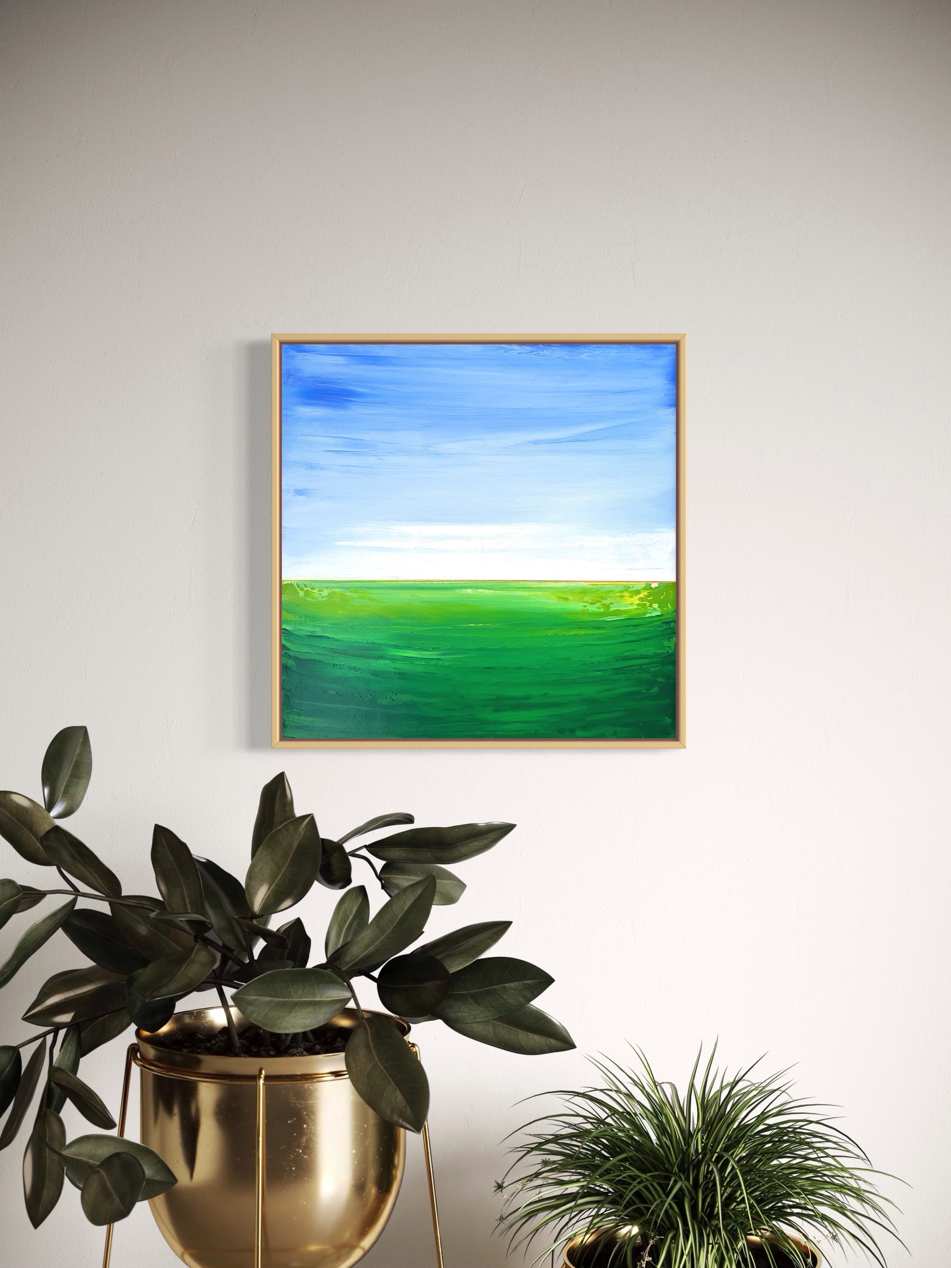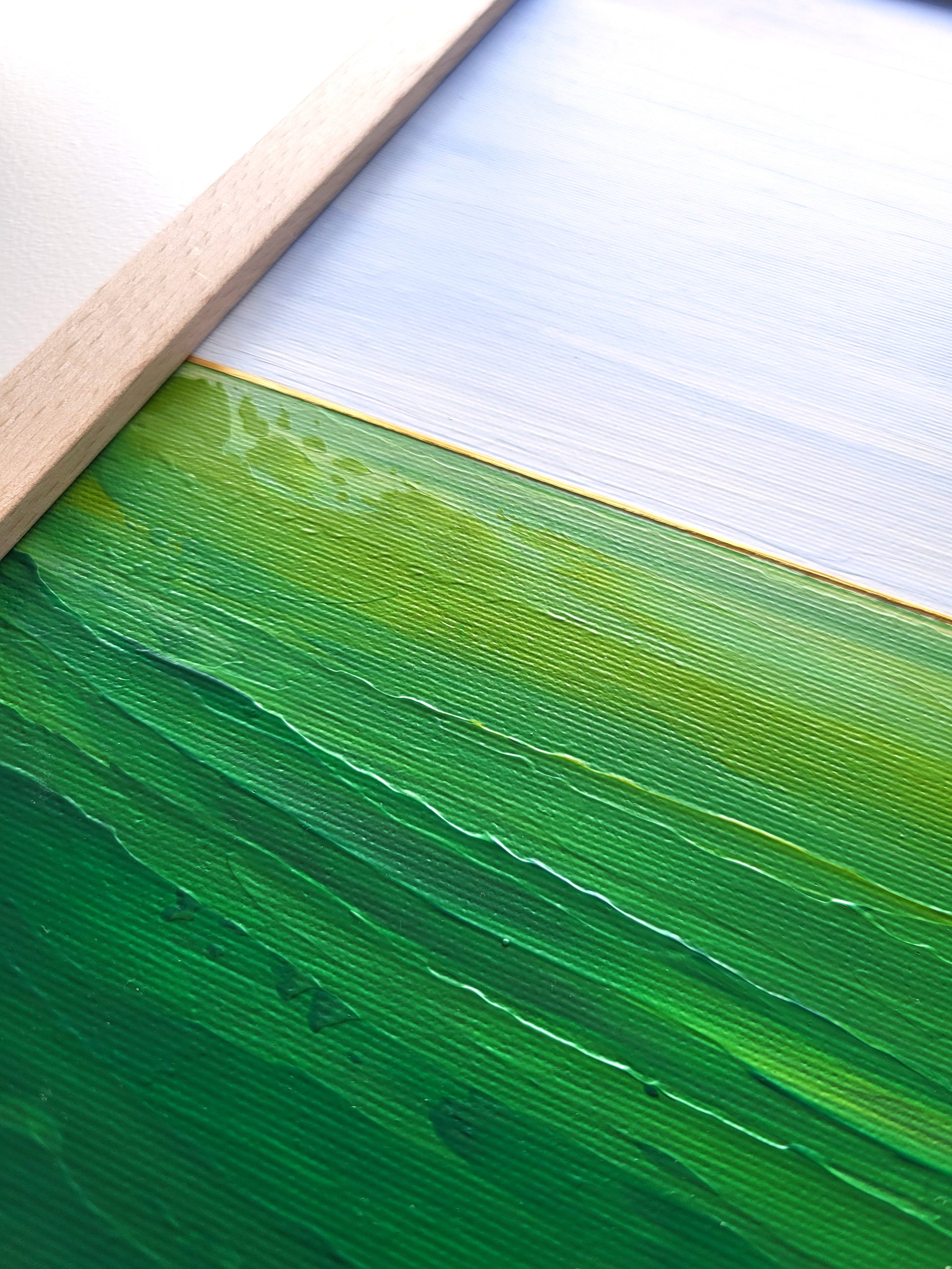 Abstrakcyjny pejzaż w kojącej zieleni i błękicie z elementami złotej metalicznej farby.