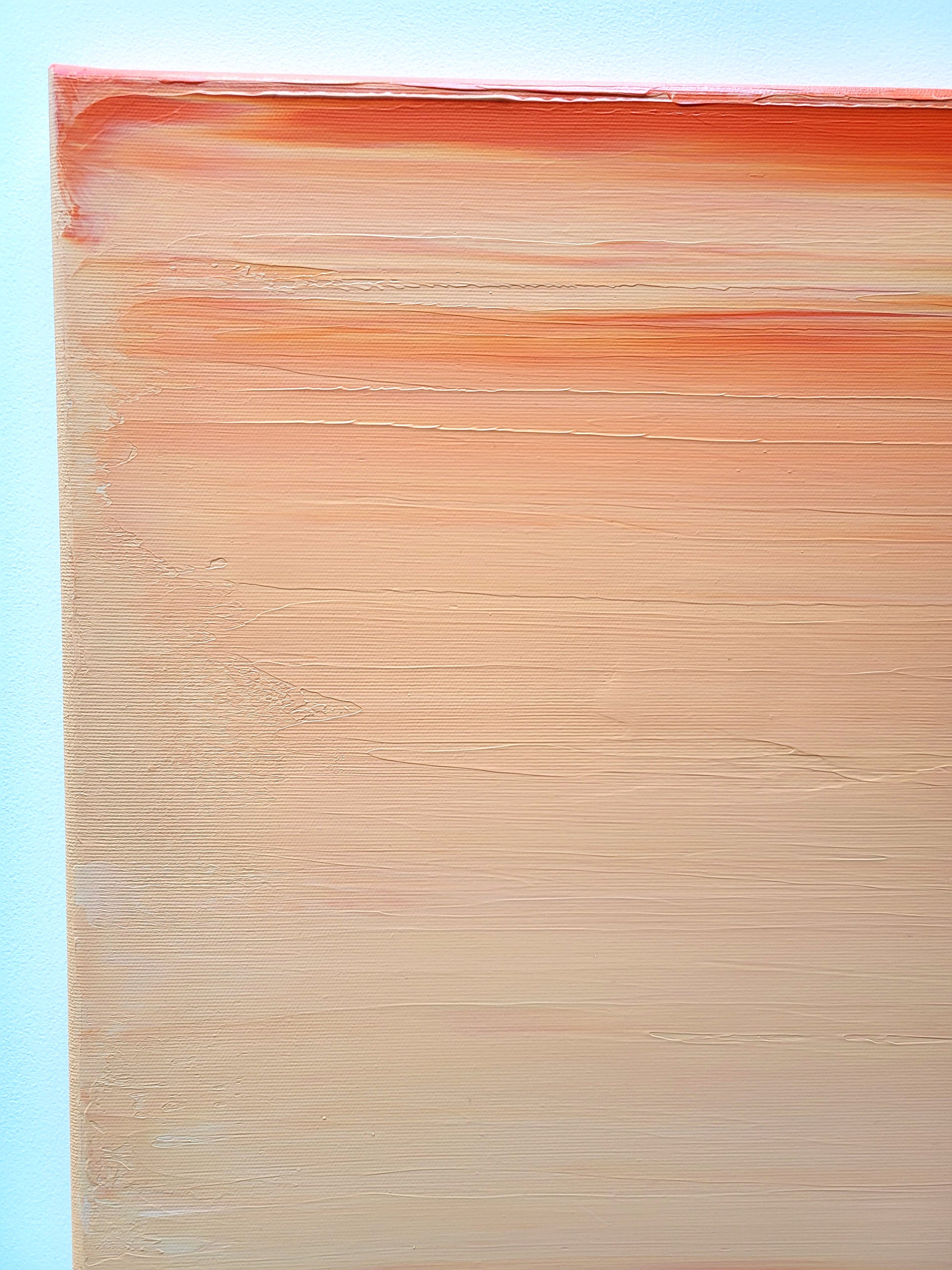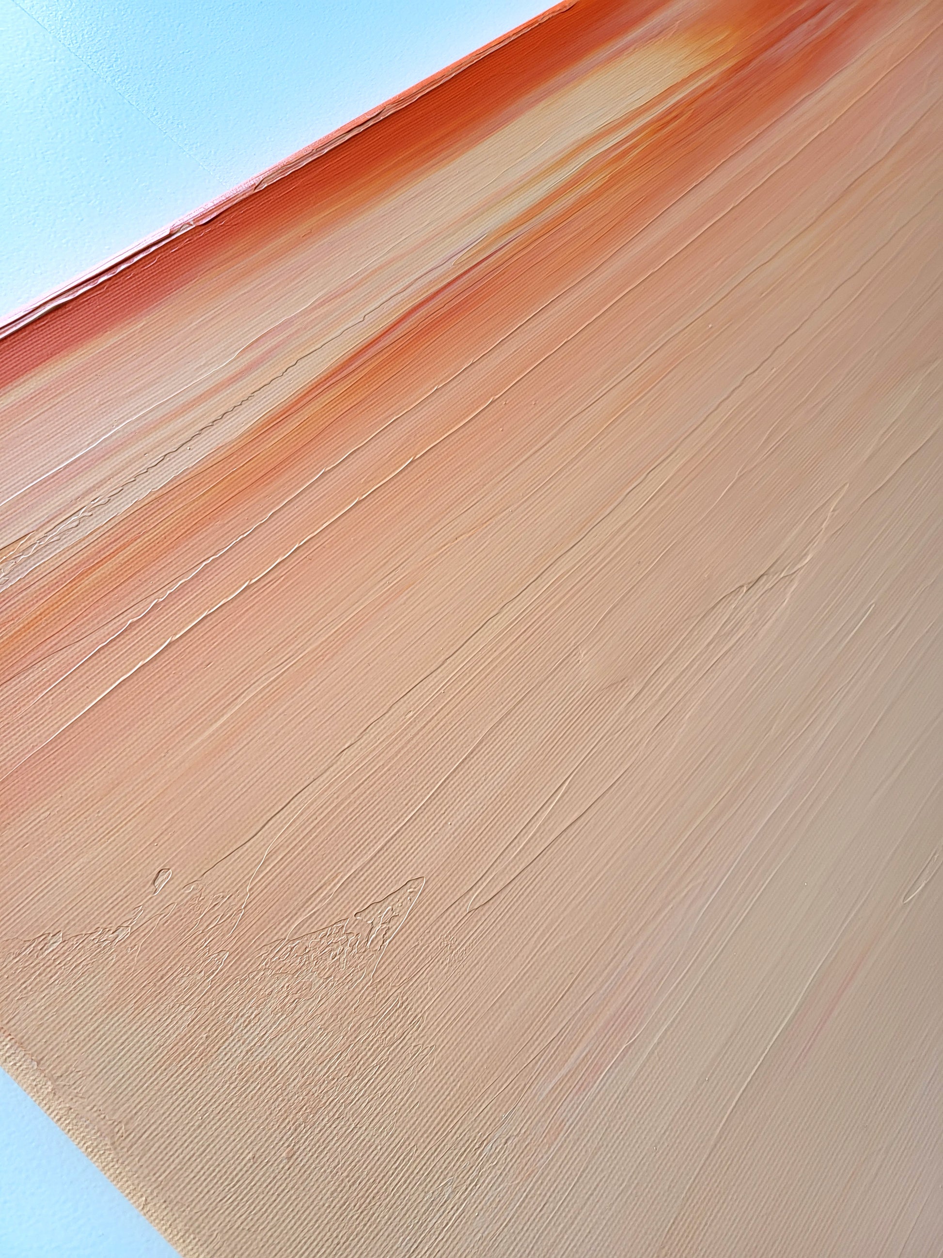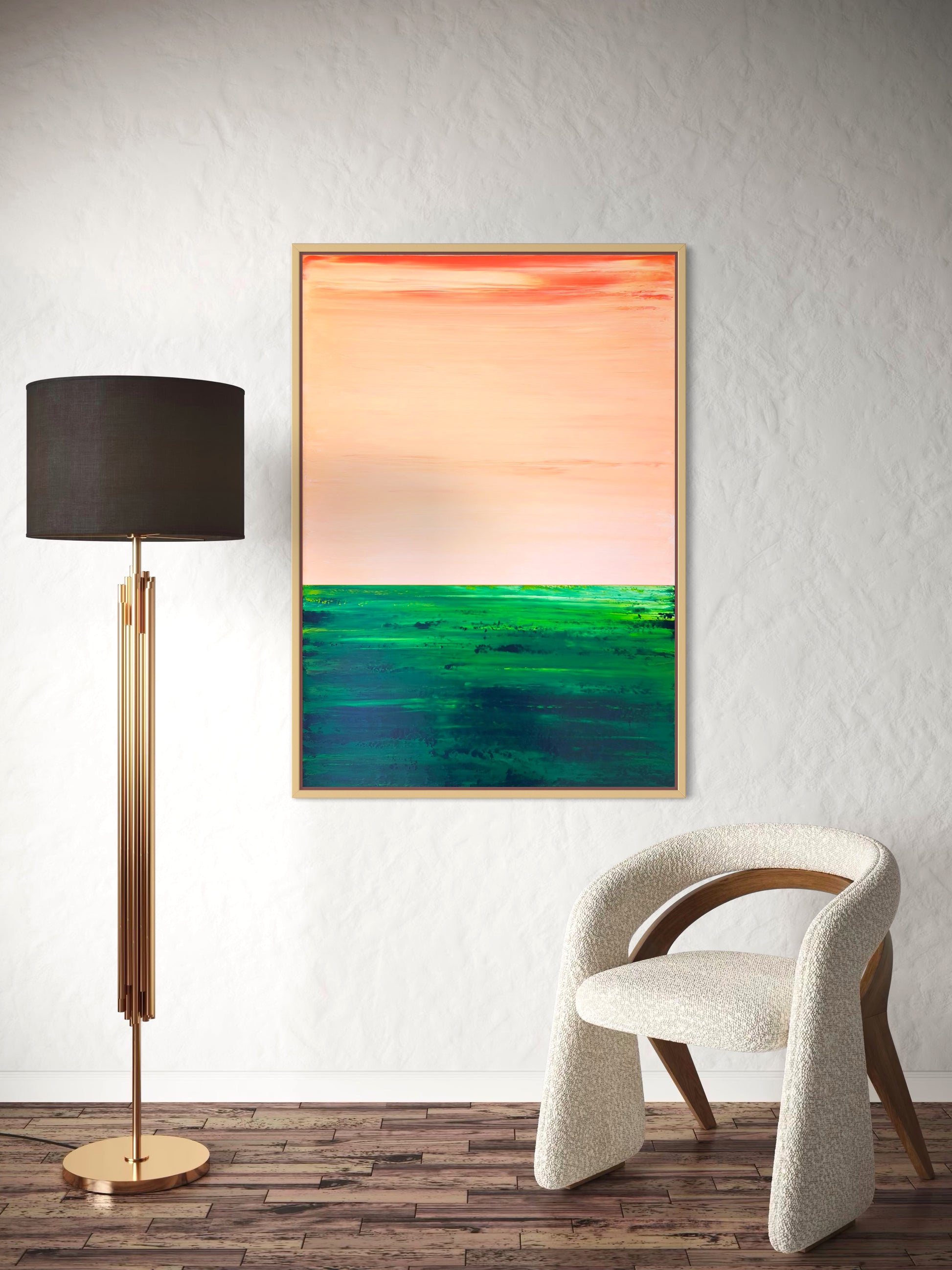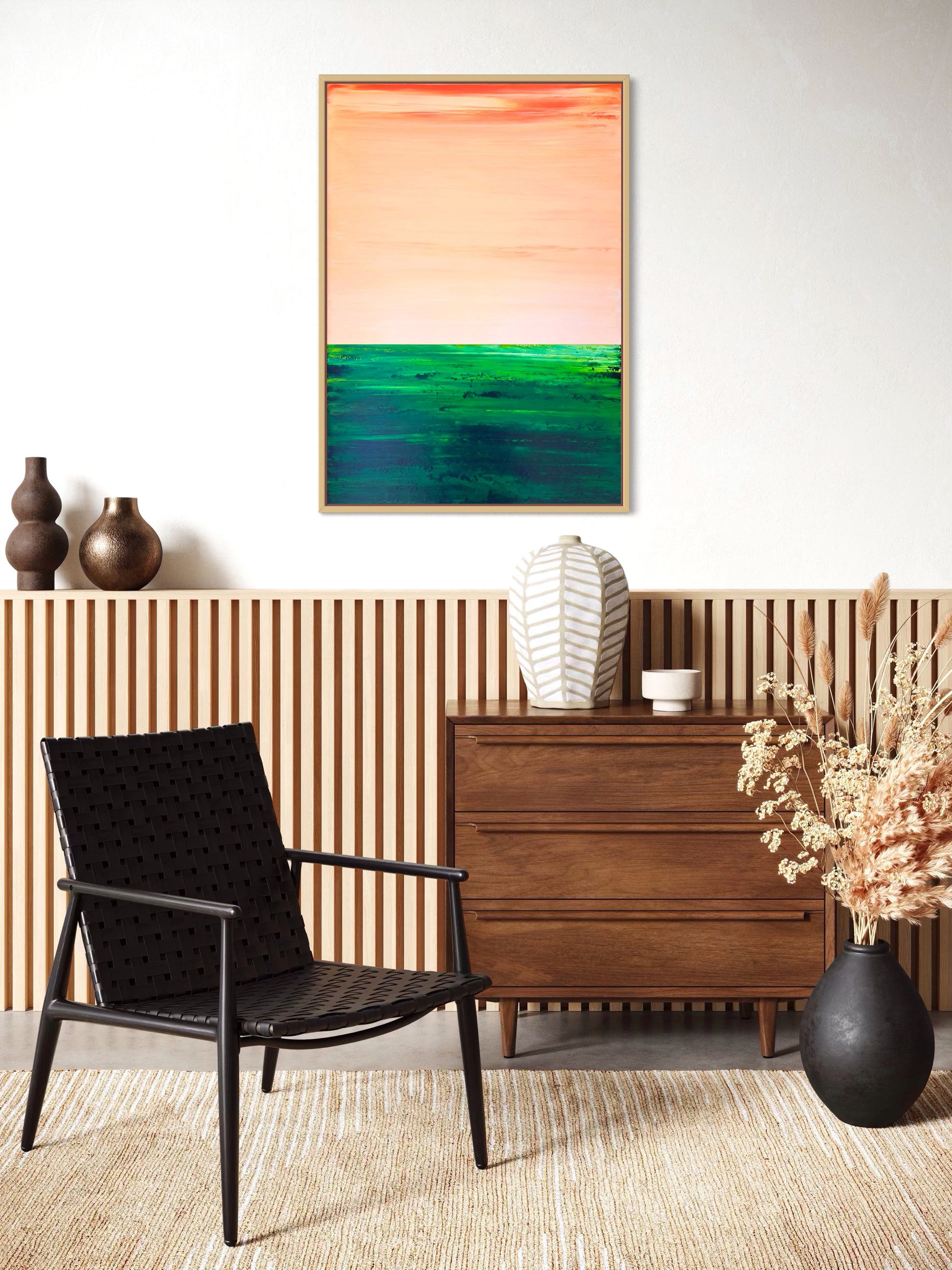 Pionowa wariacja obrazu "Sanctuary" w kojącej, zielono-brzoskwiniowej tonacji z elementami metalicznej złotej farby. Boki stanowią kontynuację obrazu, gotowy do zawieszenia.