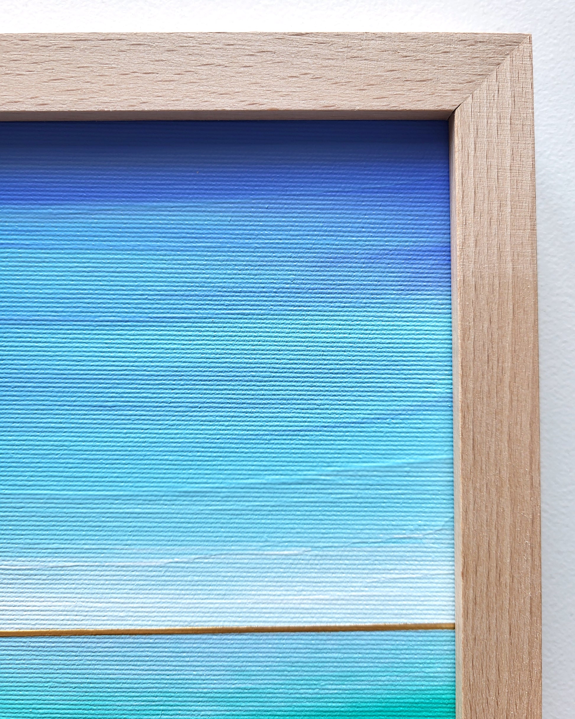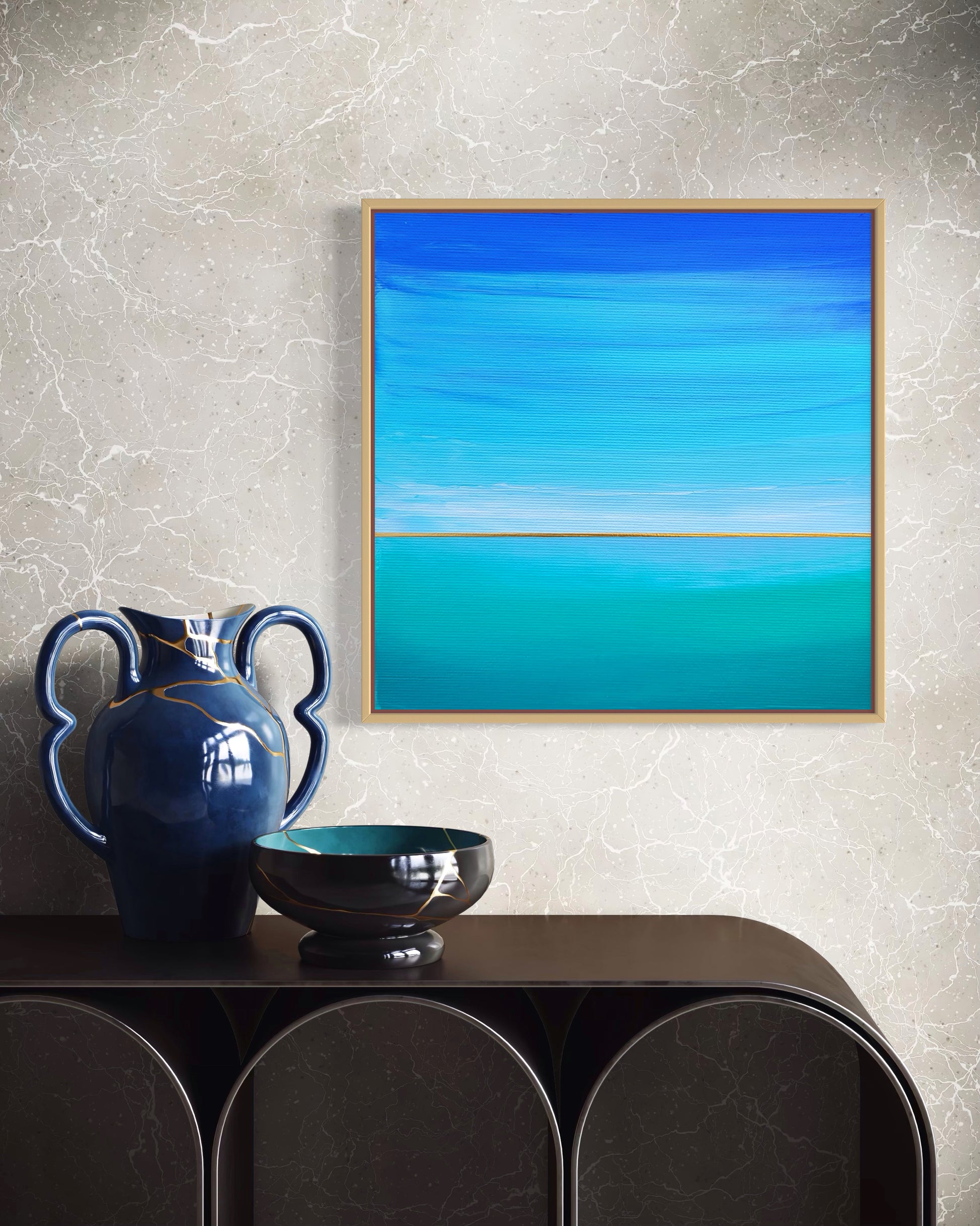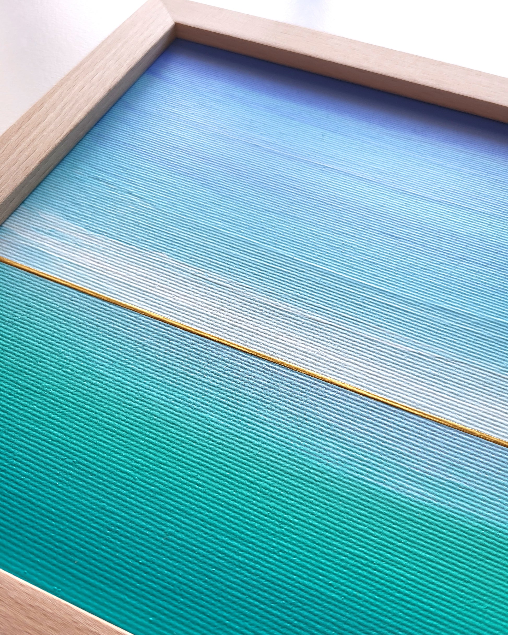 Niebiesko-turkusowa morska toń pełna tajemniczych szeptów... Abstrakcyjny pejzaż w odcieniach zieleni, turkusu i błękitu z elementami złotej metalicznej farby.