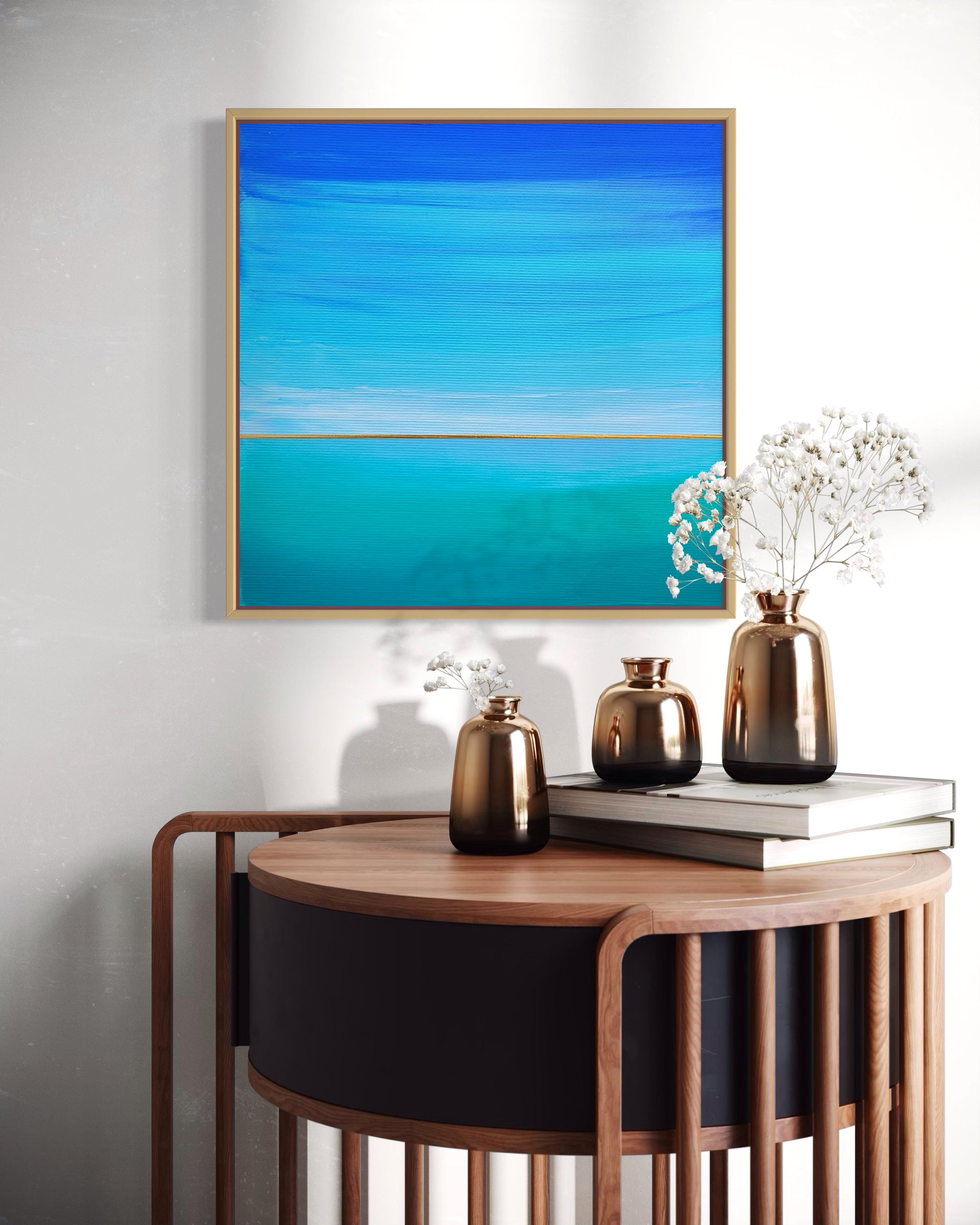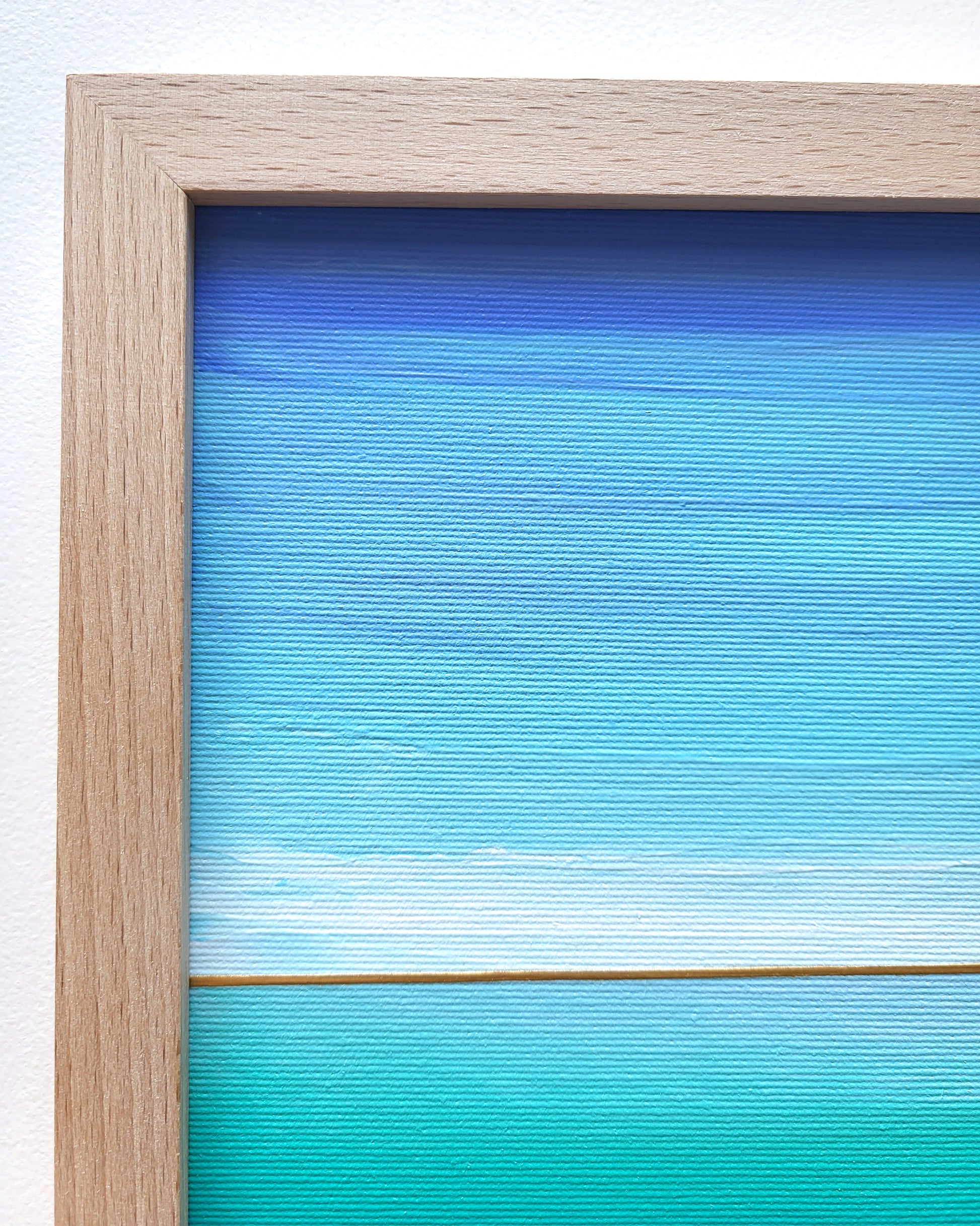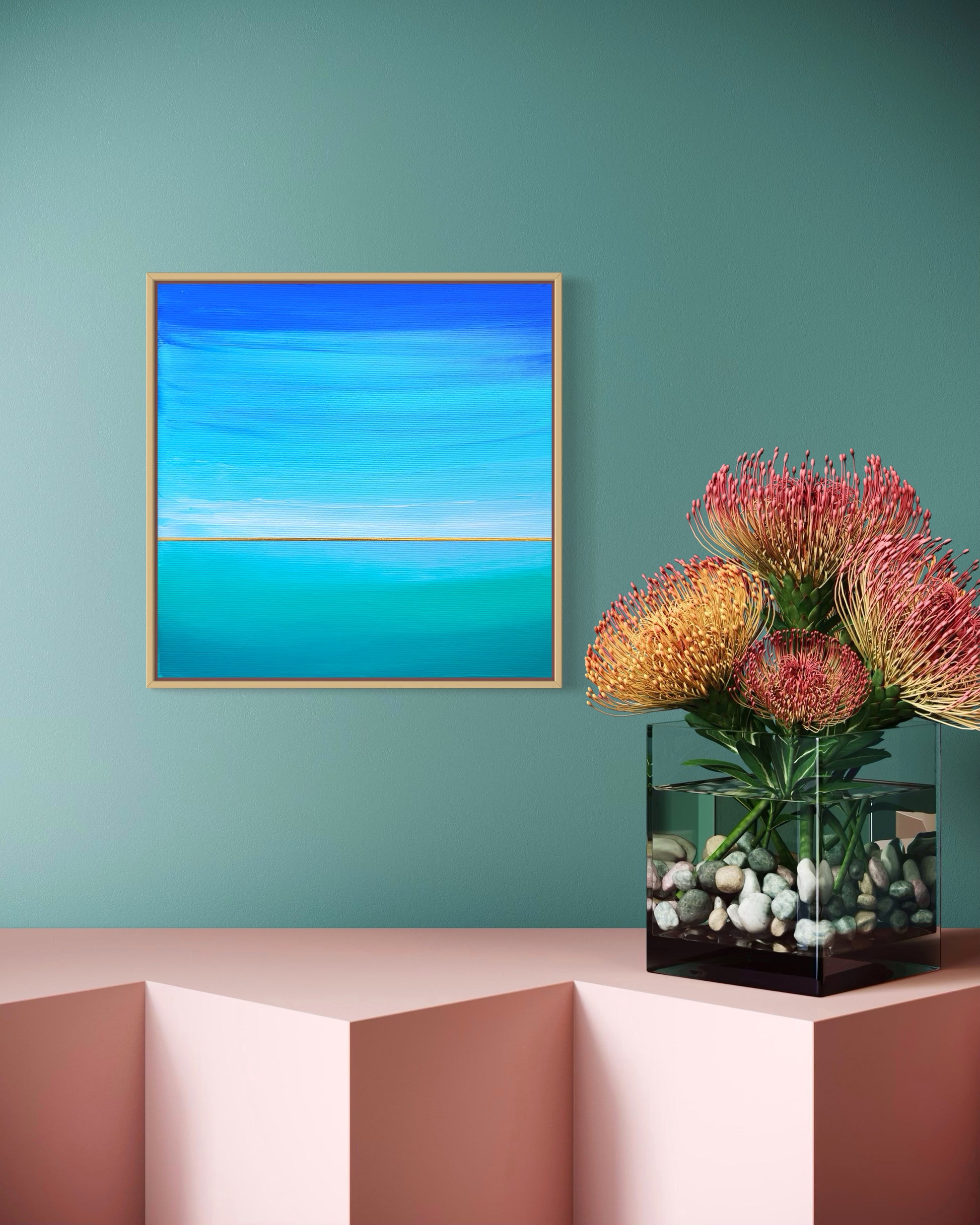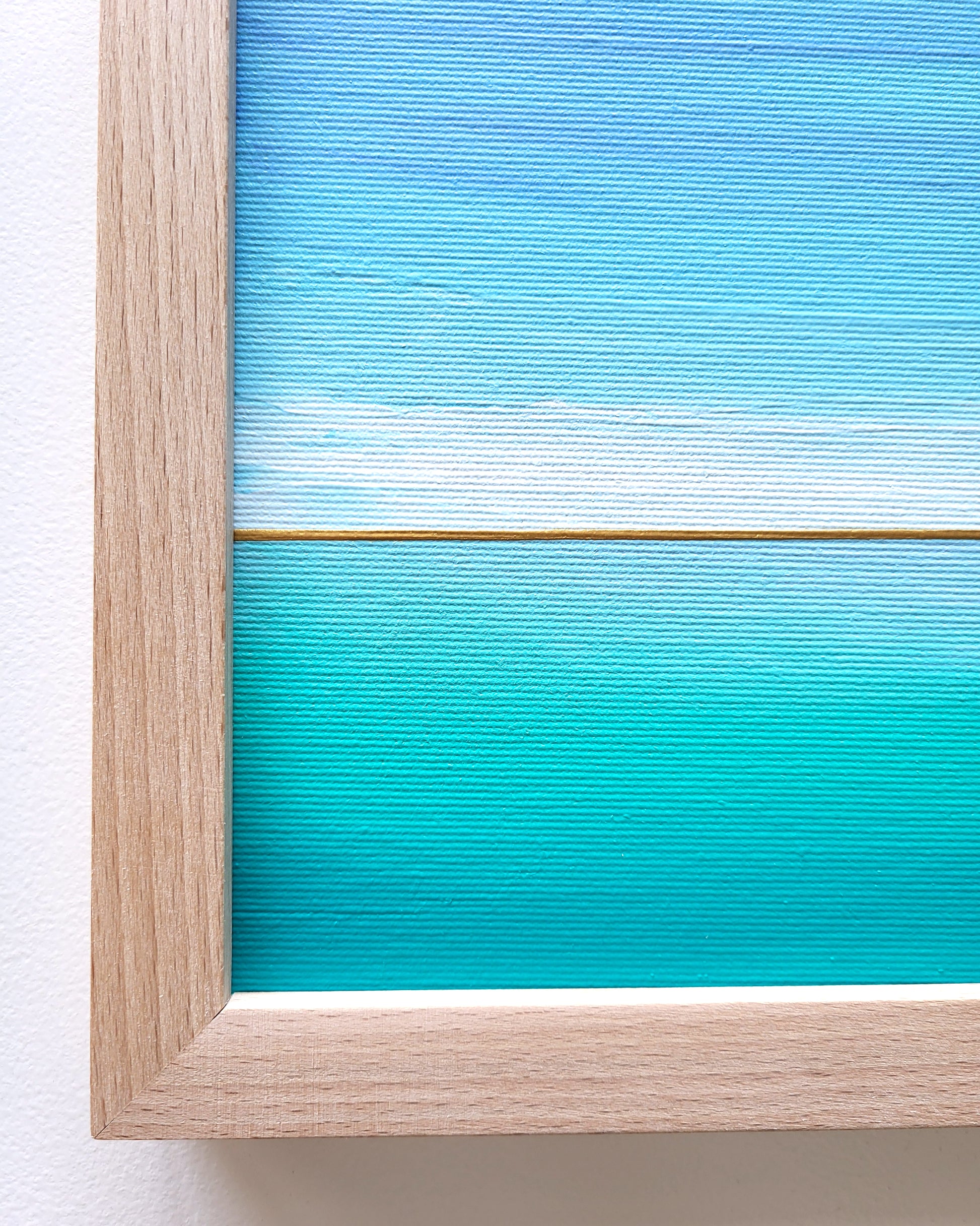 Niebiesko-turkusowa morska toń pełna tajemniczych szeptów... Abstrakcyjny pejzaż w odcieniach zieleni, turkusu i błękitu z elementami złotej metalicznej farby.