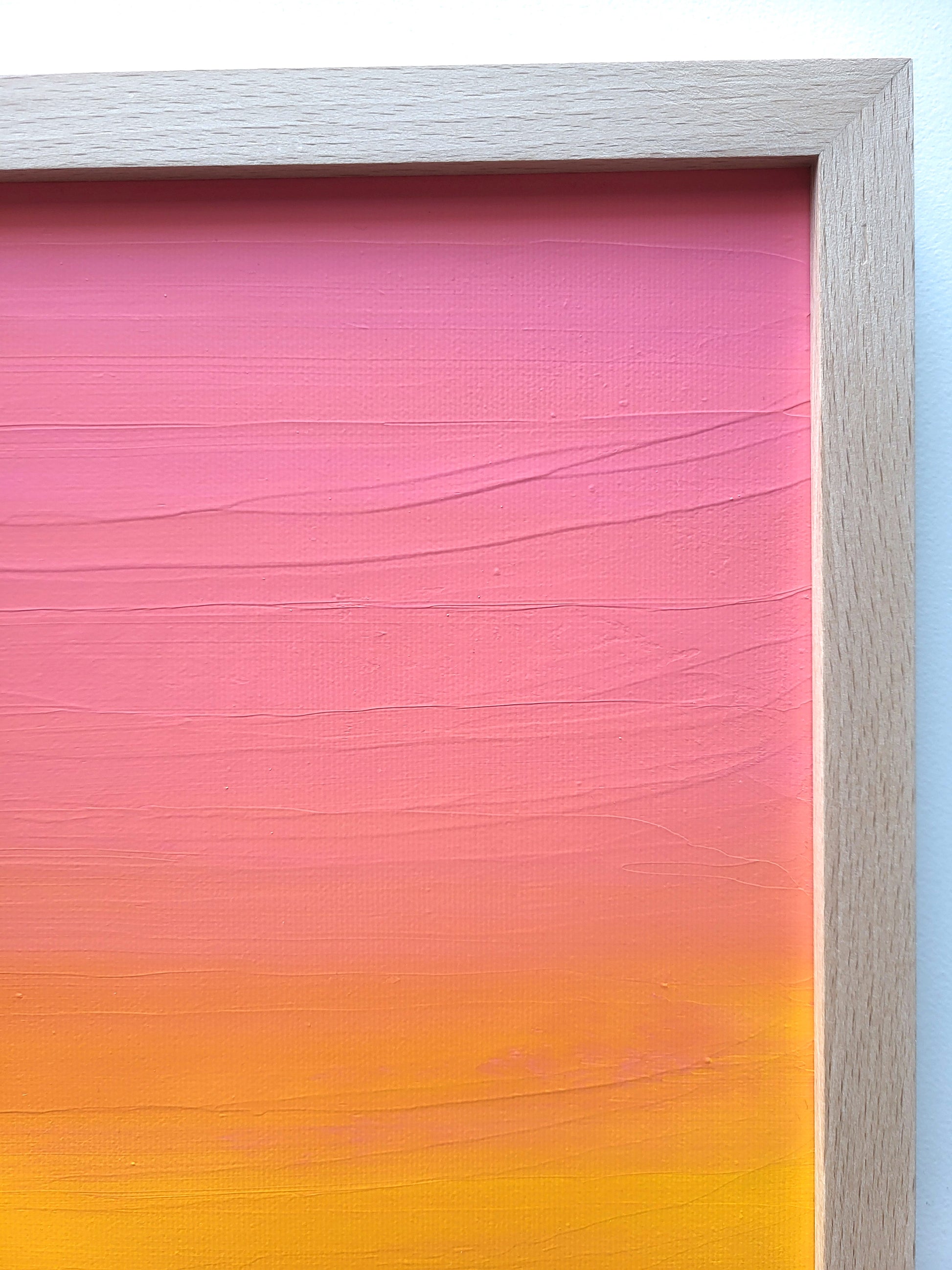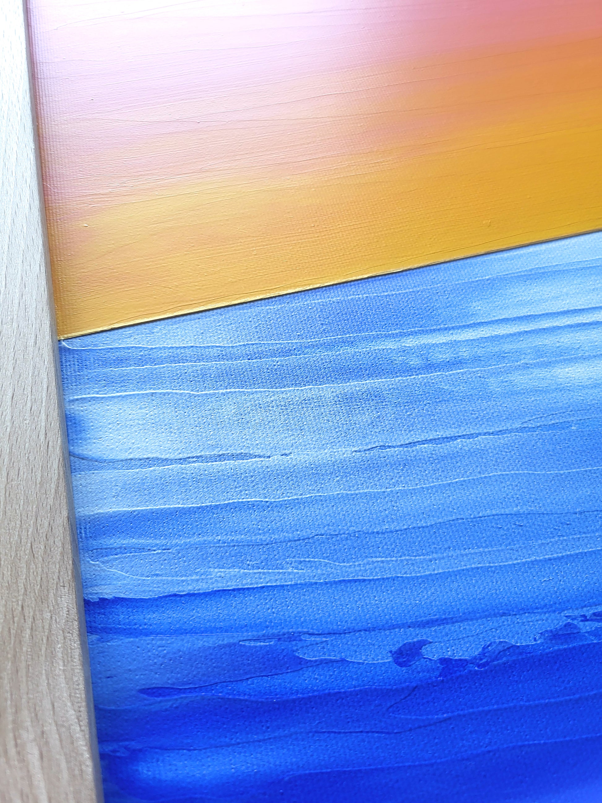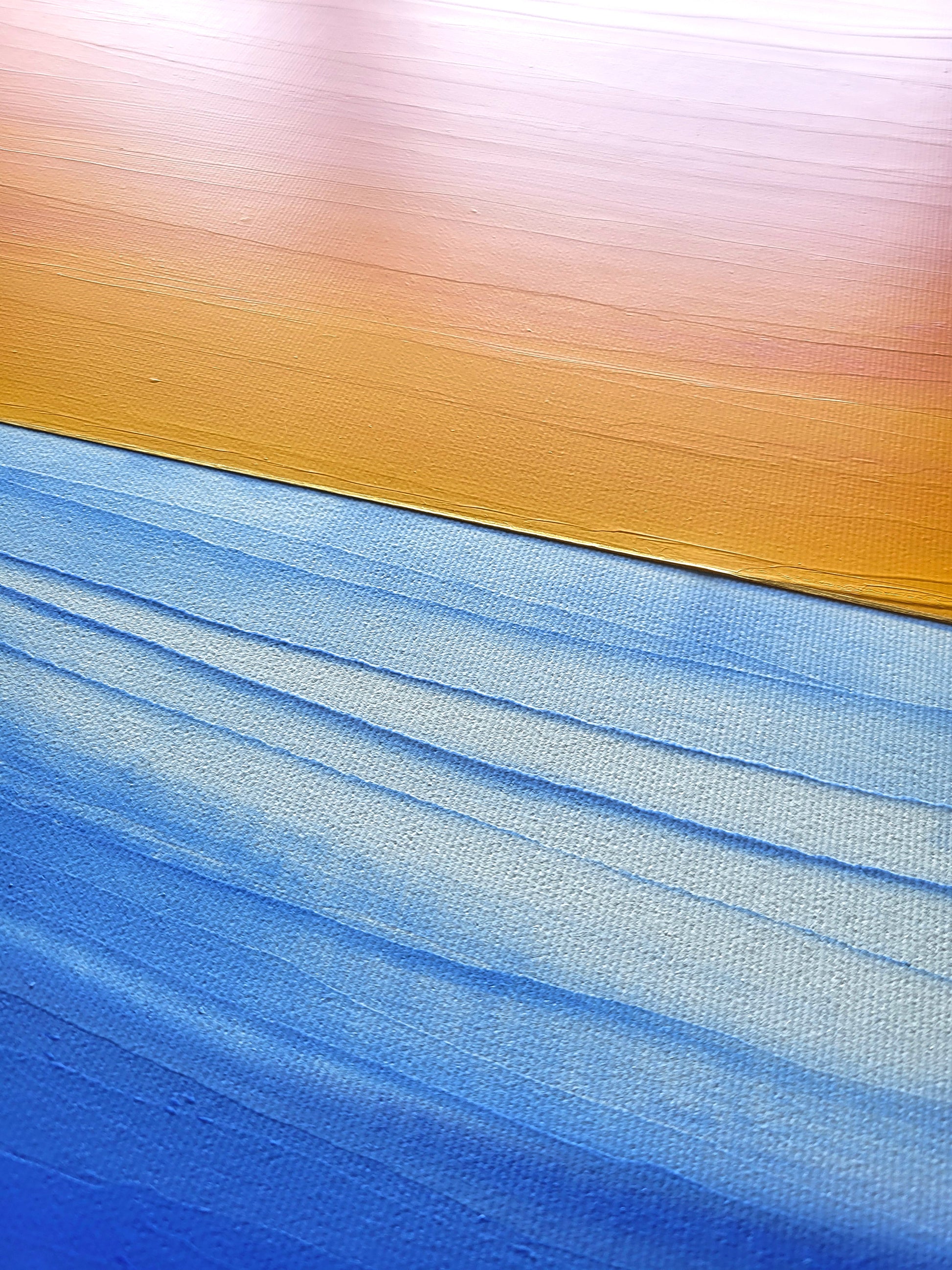 Jeziorne wody pełne słonecznego światła... Abstrakcyjny pejzaż w głębokich niebieskościach i ciepłych odcieniach różu oraz żółci z elementami złotej metalicznej farby.